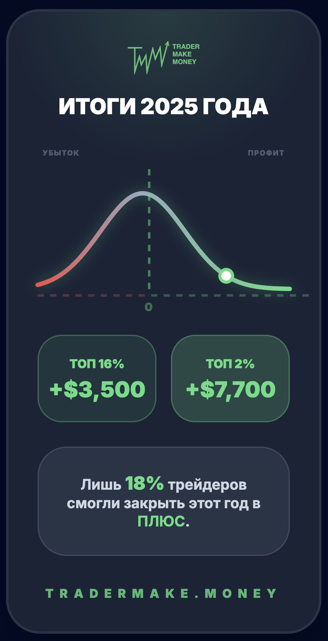 Цифры суровые: лишь 18% трейдеров смогли закрыть этот год в плюс. Вдумайтесь: если вы закончили год в зеленой зоне — вы уже лучше 82% участников рынка.