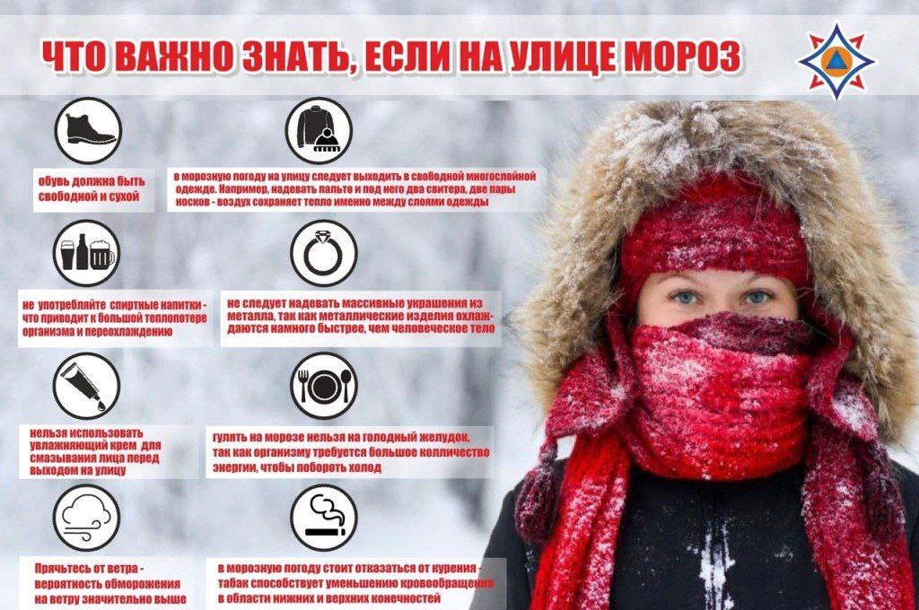 ❄️ при первых признаках обморожения (побледнение кожи, онемение, покалывание) необходимо немедленно пройти в тёплое помещение и обратиться за медицинской помощью;