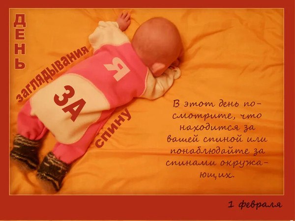 День заглядывания за спину.Как ни странно, этот праздник посвящен заглядыванию за спину. Бывает, что идешь по улице и слышишь, как где-то сзади раздаются еле слышные шаги, в этот момент многие думают, обернуться или нет? Шаги легкие, они еле слышны, но ничего плохого за спиной быть не может. Значит, если обернуться, можно увидеть что-то чудесное, а может, и не оборачиваться вовсе? Так вот люди и идут, борются со своим любопытством. Об этом празднике мало что известно, но его отмечают каждый год 1 февраля.