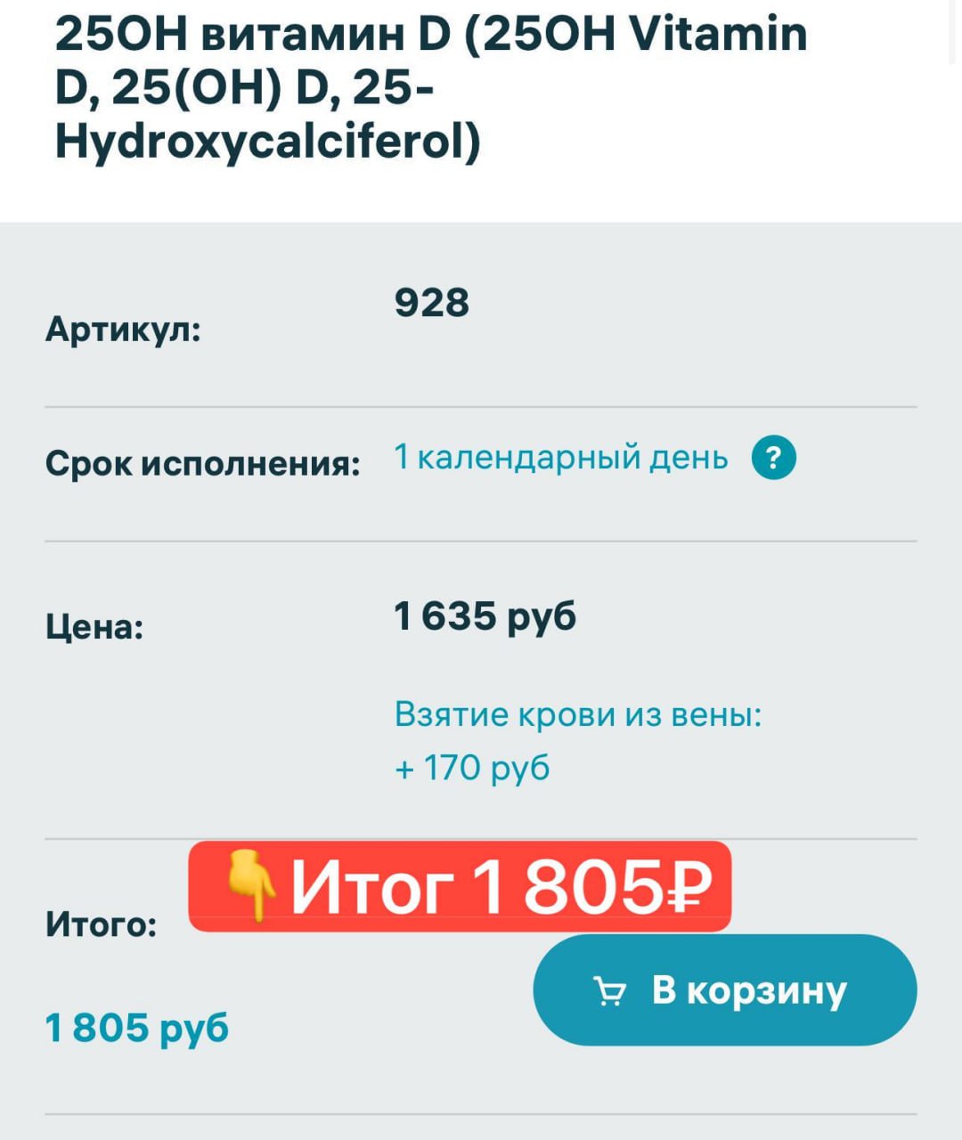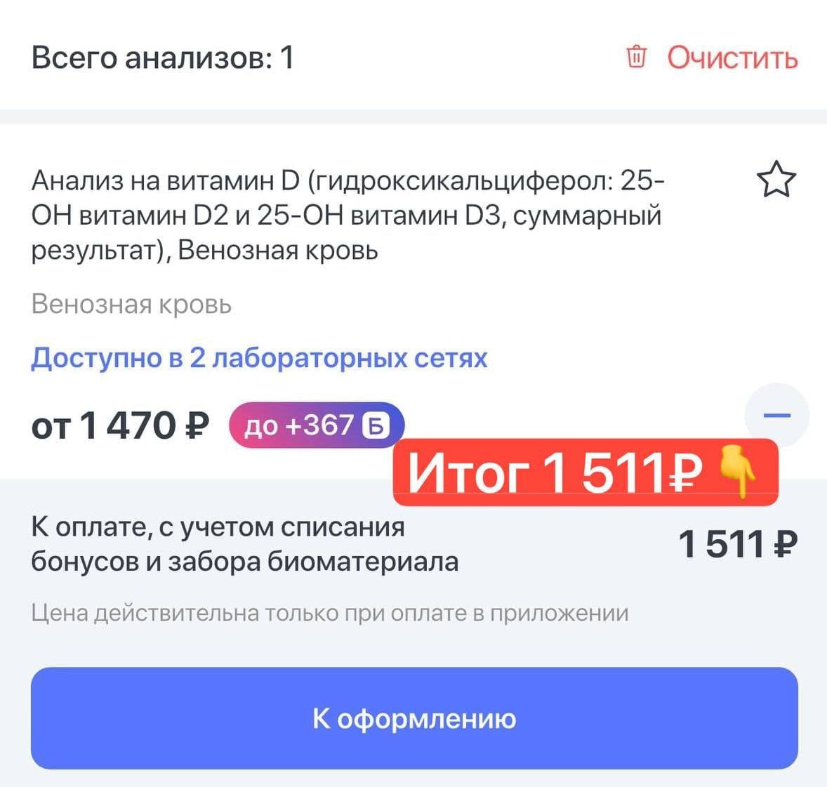 Сравнивали стоимость анализа витамина D3, через приложение HelloDoc и напрямую в Инвитро, выгоднее оказалось в Хэлодок. 1 511₽ с баллами против 1 805₽ напрямую.