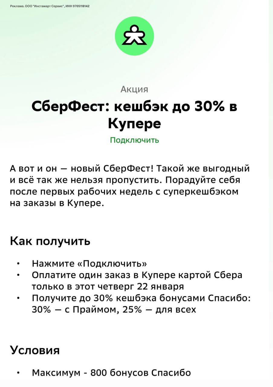Кэшбэк до 30% в Купер по СберФест только сегодня + промокоды🔥