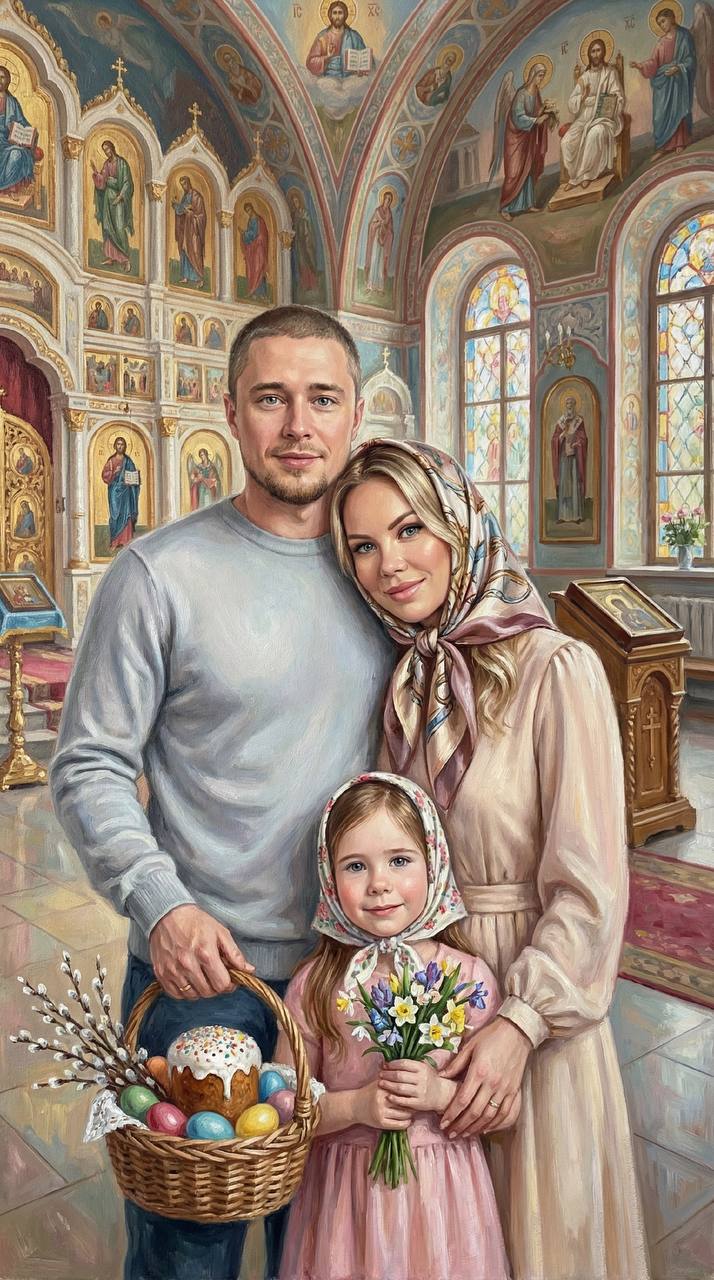 Одень персонажей в одежду, конкретно в те наряды,которые одевали или одевают на праздник Пасхи в 2026 году. Учитывай, голова женщин должна быть покрыта косынкой, платком или шарфом . Место действия - православный храм - также должно отражать окружение 2026 года