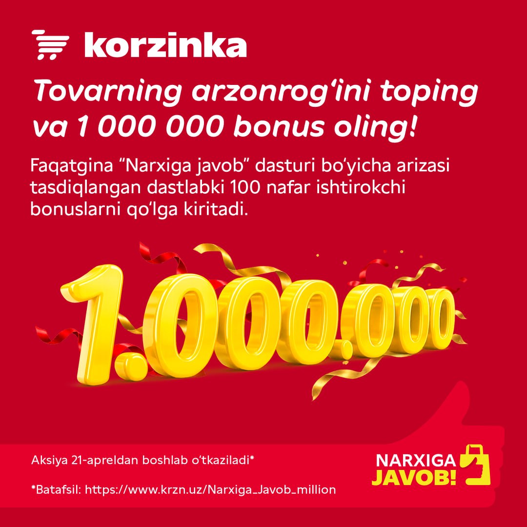 🔥 “Narxiga javob” dasturi bo‘yicha ariza qoldiring va Korzinka Plus kartasiga 1 000 000 bonus olgan 100 nafar ishtirokchidan biriga aylaning!