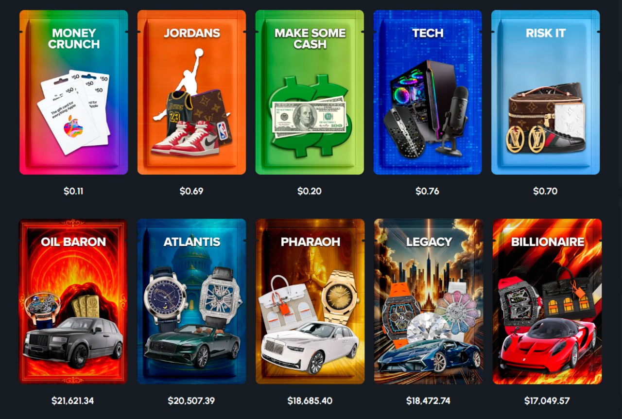 Привет-привет! Всё на самом деле просто: пользователь покупает определенный кейс за деньги. Далее начинается настоящий гемблинг: игроку могут выпасть Ролексы, а может Ламба. Может ничего не выпасть или выпасть... снежинка стоимостью $0,01. Зависит от стоимости кейса: например, это может лутбокс стоимостью $0,5, а может быть набор для богатых стоимостью $7k (фото 2).