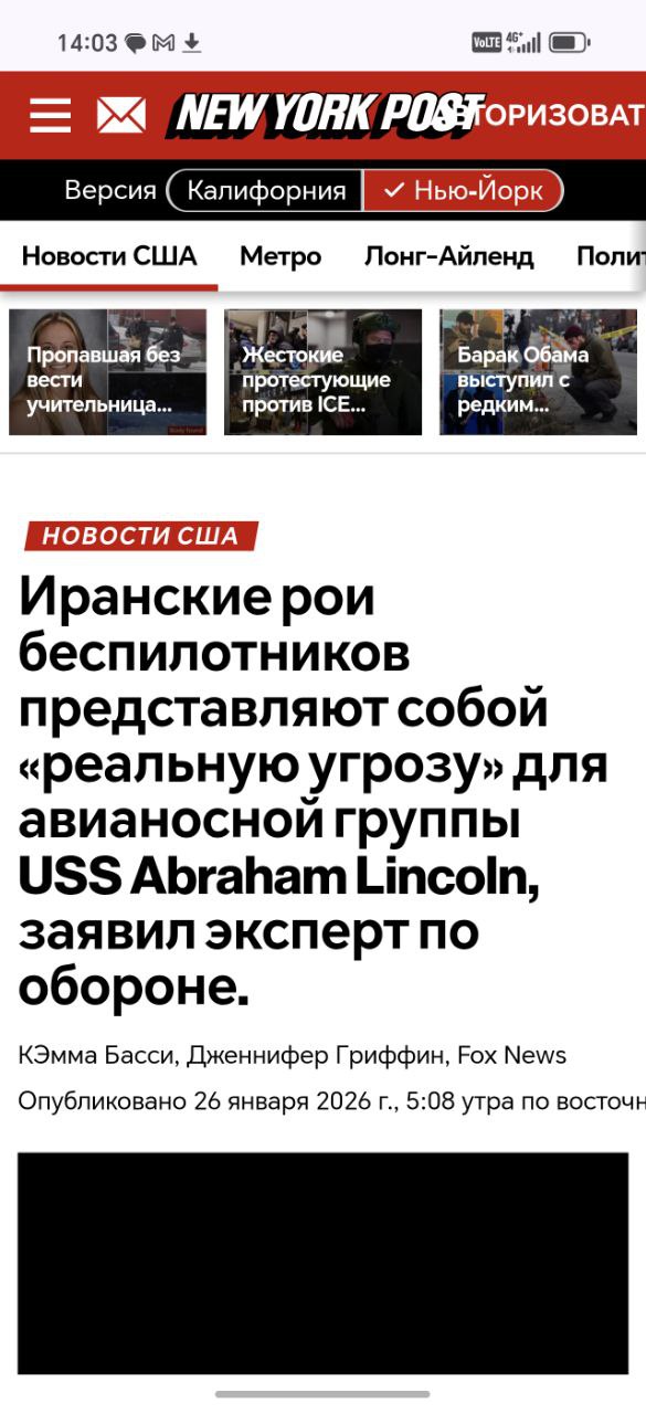 ❗️The U.S. aircraft carrier Abraham Lincoln is positioned near the southern coast of Oman and is not approaching the entrance to the Persian Gulf. ⚓️ A likely reason for the pause may be concerns over Iranian drone swarms, which U.S. military command reportedly fears, according to the New York Post. Accounts close to U.S. intelligence, including Aquilla, report that Iran’s top leadership has already designated successors in case they are targeted in a leadership decapitation strike, and that those successors have been briefed on retaliatory measures. Original Post Join @TranslatedRussianNews