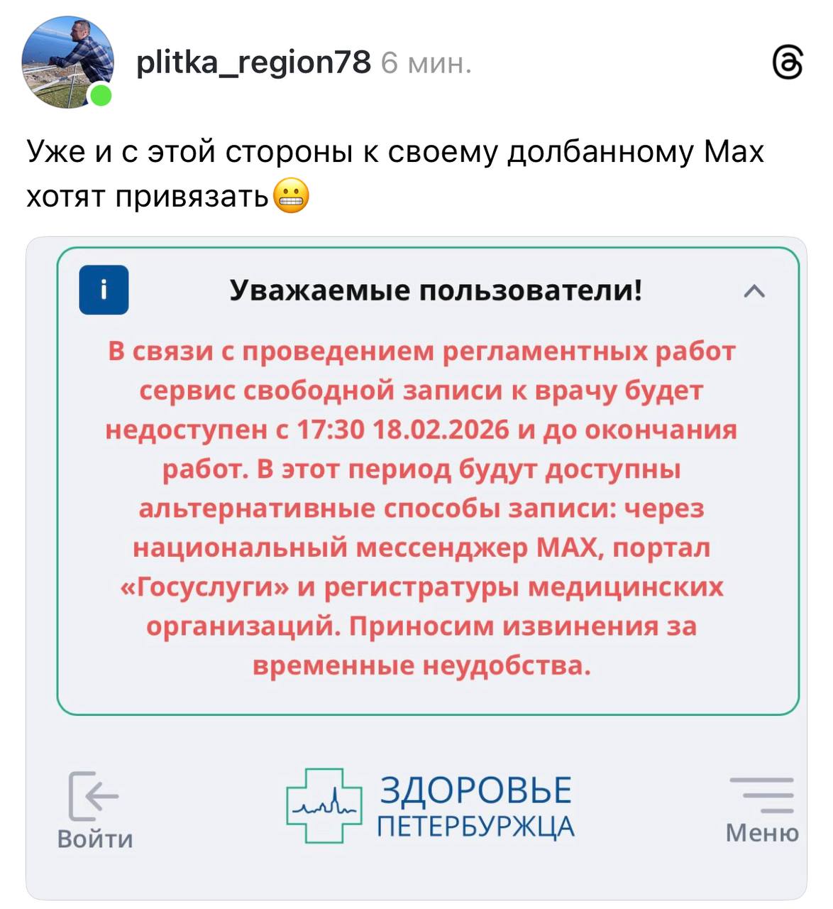 Россиянам из Питера не дают записаться к врачу без Max. Ещё с 18 февраля портал «Здоровье петербуржца» на неопределённый срок перестал работать из-за проведения регламентных работ. На это сейчас петербуржцы жалуются в соцсетях.