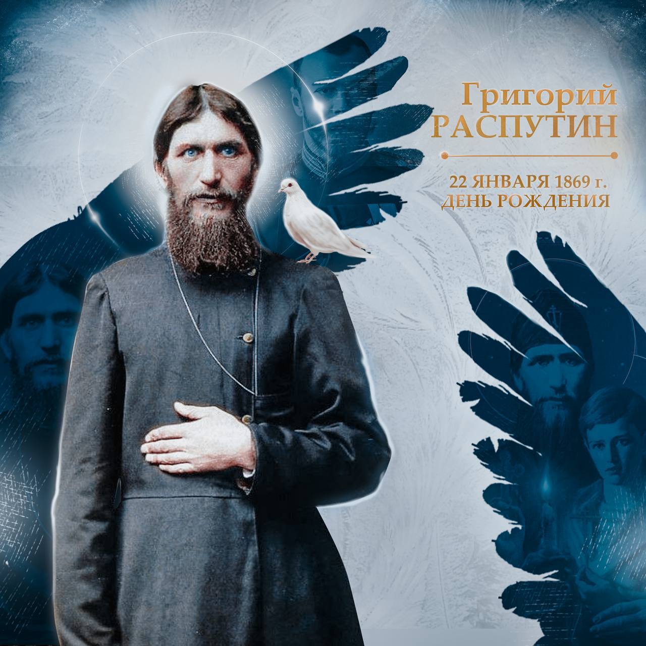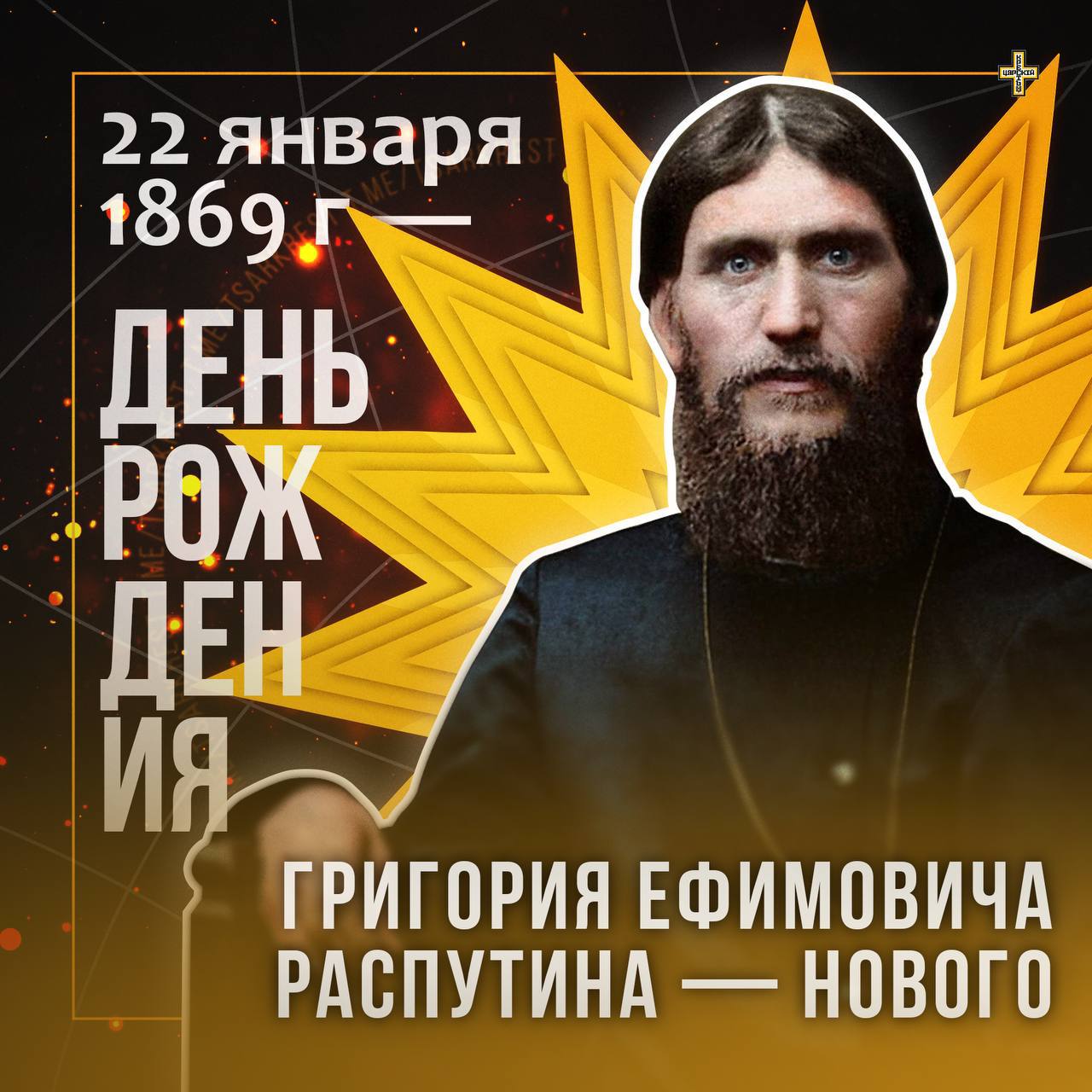 22 (9) января 1869 г. родился Царёв друг, крестьянин Григорий Ефимович Распутин-Новый В память святителя Григория Нисского младенца крестили с именем Григорий, что значит «бодрствующий». В метрической книге Покровской слободы в части первой «О родившихся» рукой священника Николая Титова записано: «9 января 1869 года у крестьянина Слободы Покровской Ефима Яковлевича Распутина и жены его Анны Васильевны вероисповедания православного родился сын Григорий.» Крестили его 10 января, в день празднования святителя Григория Нисского. Восприемниками были дядя Матвей Яковлевич Распутин и девица Агафья Ивановна Алемасова. Фамилия Распутин происходит от слова "распутье", т.е. - перекрёсток дорог. Семь семей в Покровском носили фамилию Распутины, довольно распространенную в Сибири. Из книги Г.Е.Распутина "Благочестивые размышления", изданной в 1912 году: Дружба с Богом – тяжелые гонения и потеря того, что любишь. Радостный день в гоненье, да не всяк вместит. Почему же дружба с Богом - это обязательные гонения? Потому, что дружба с Богом - это любовь к ближнему и к правде, отрицание всякой лжи, но наш мир построен на лжи, он ненавидит правду, следовательно, всякий, возлюбивший правду и идущий за Богом, противен миру, противен людям, следующим закону мира, а не закону Божию. Почему, возлюбивший Бога теряет, но не приобретает? Потому, что теряет земное, мирское, но приобретает взамен вечное - Божие, не этот мир, но Горнего Иерусалима. Дружба с Богом - это всегда жертва, ибо пожертвовать нужно этим миром, чтобы приобрести мир иной, ибо нельзя служить двум господам одновременно. Возлюбив Бога, возненавидишь мир земной - иного не дано. Именно поэтому, радостен день в гоненье, то есть в нелюбви этого мира, ибо в этот момент возлюбил тебя, о человек, мир Горний, мир Божий, преисполненный неугасающей, вечной любви Божией, которую нельзя измерить земными рамками.