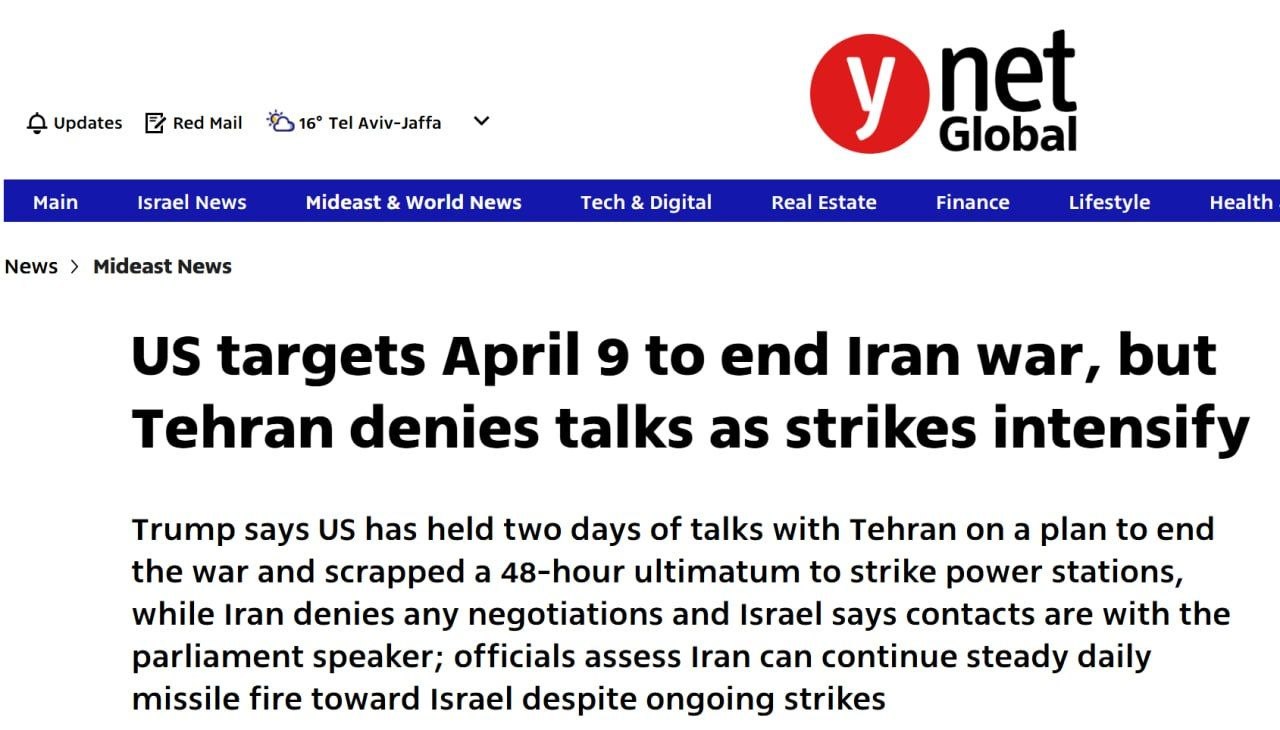 - США назначили 9 апреля датой окончания конфликта с Ираном, утверждает Ynet. Это позволит Трампу прибыть в Израиль в День независимости и получить государственную премию, объясняет израильский источник издания;