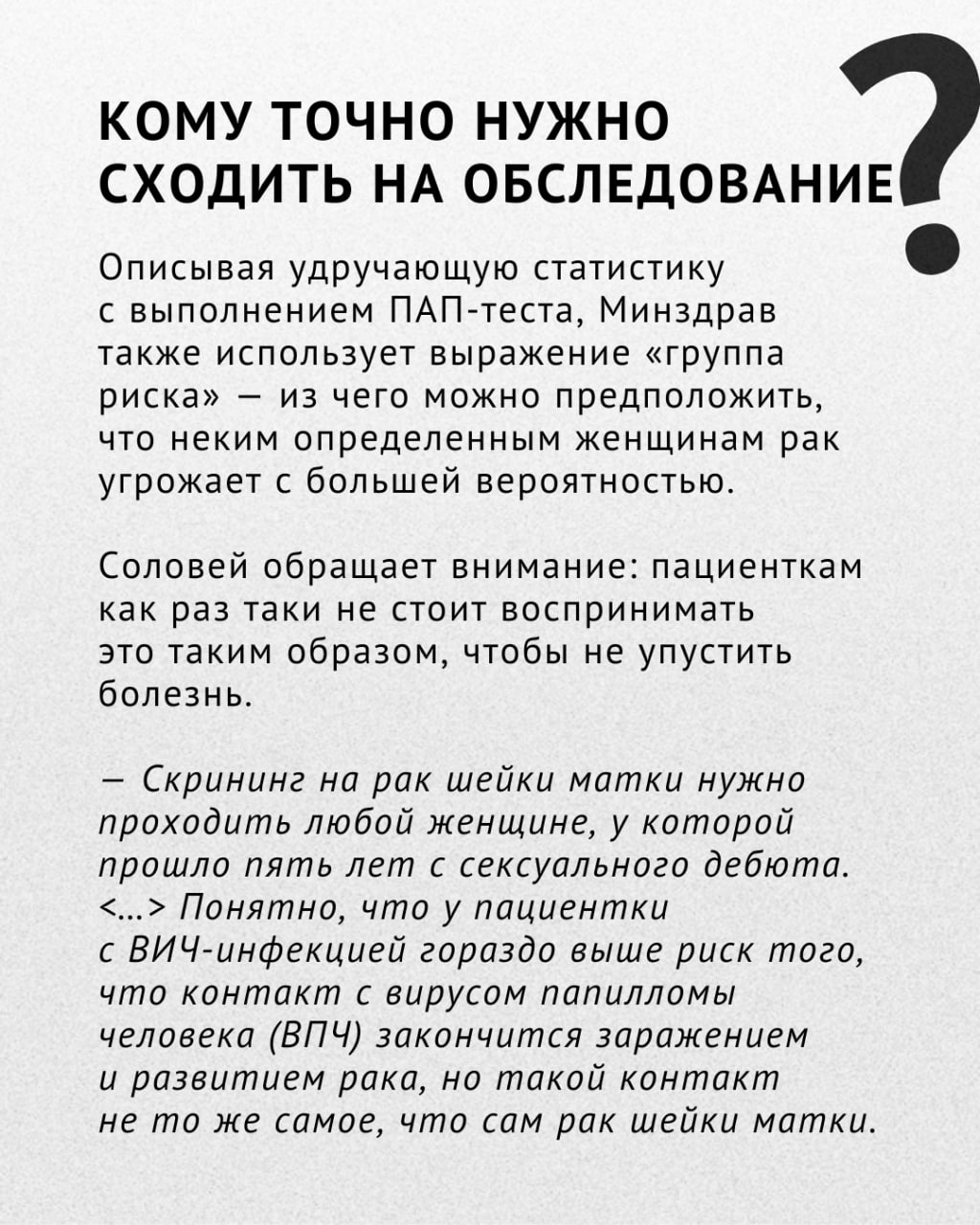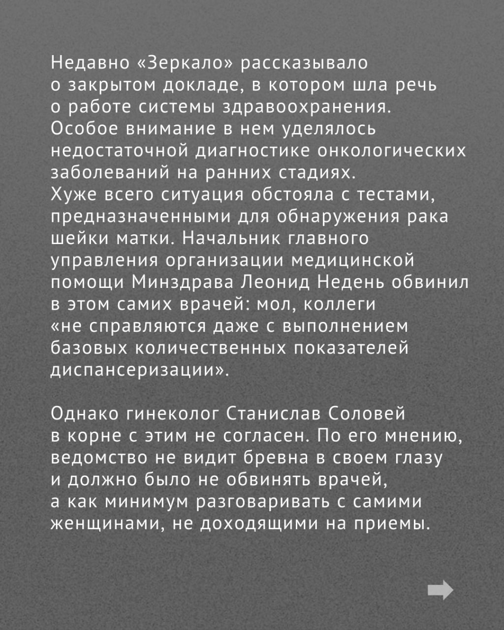 На днях «Зеркало» рассказывало о закрытом докладе, в котором шла речь о работе системы здравоохранения. Особое внимание в нем уделялось недостаточной диагностике онкологических заболеваний на ранних стадиях, особенно рака шейки матки. Представитель Минздрава обвинил в этом самих врачей.