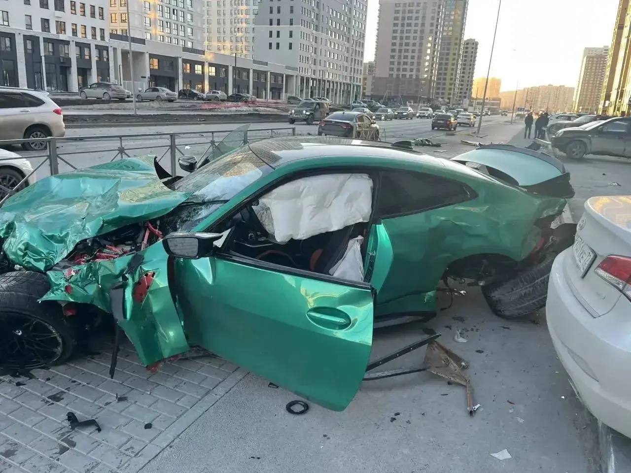 После удара «БМВ» отбросило на столб, а затем на встречную полосу, где произошло столкновение с «Хавалом». В результате этого удара «БМВ» задел еще две припаркованные машины.