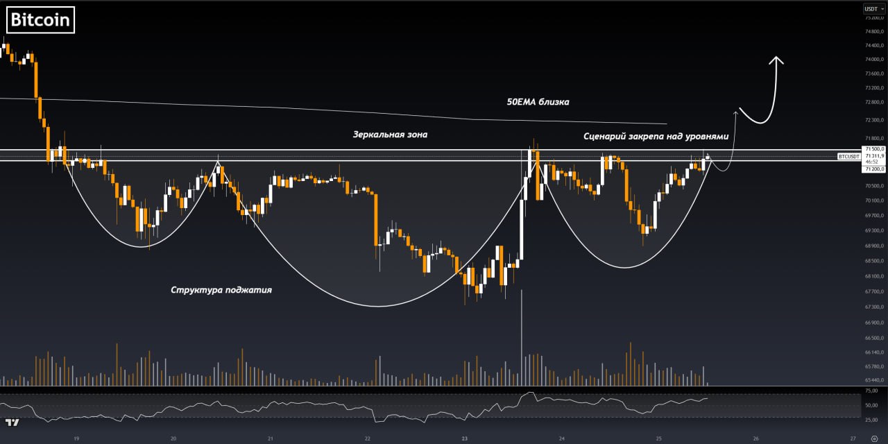 На часовом таймфрейме данный уровень раскрывается как зона между отметок ~$71,200 и ~$71,500. Также рядом проходит 50-ти дневная EMA, усиливая уровень со старшего таймфрейма.