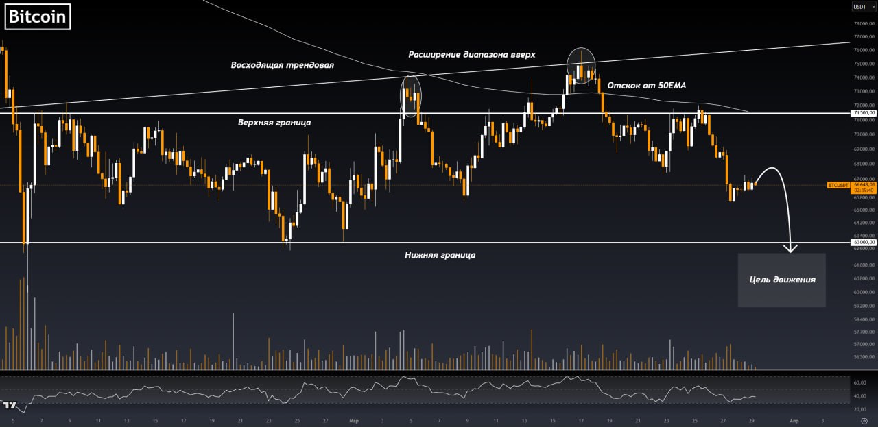 Но на последнем снижении цена плотно закрепилась под ~$71,500. Можно предположить, что снятие ликвидности сверху завершено. С большой вероятностью далее нас ждёт снятие ликвидности ниже ~$63,000 📉.