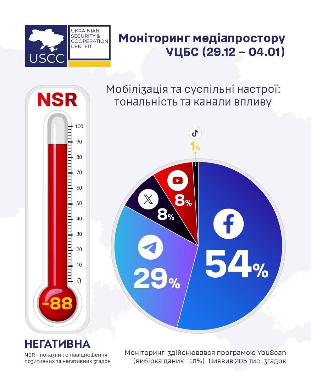 Про це свідчать результати моніторингу (https://www.facebook.com/100070990036711/posts/902268068816186/?rdid=vSRS7b6DR5QYr0rR#) Українського центру безпеки та співпраці (УЦБС), проведеного в період з 29 грудня 2025 року по 4 січня 2026 року, повідомляє Українська Служба Інформації.
