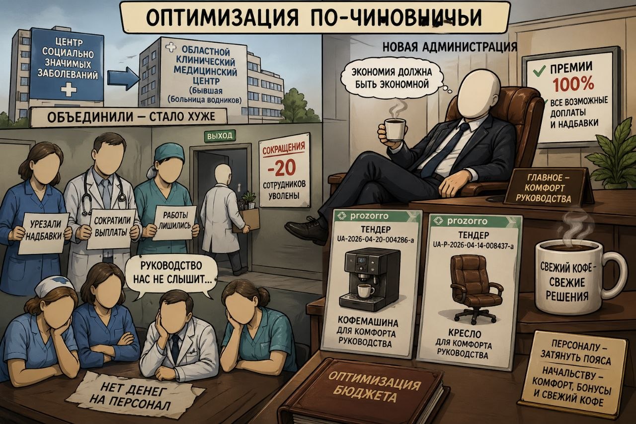 И на этом фоне особенно показательно выглядят закупки учреждения. В системе Prozorro появился тендер UA-2026-04-20-004286-a на кофемашину и тендер UA-P-2026-04-14-008437-a на кресло. Всё — для комфорта нового руководства. Пока персоналу рассказывают о нехватке средств, сокращениях и необходимости экономить, на удобство кабинетов деньги находятся без особых проблем.
