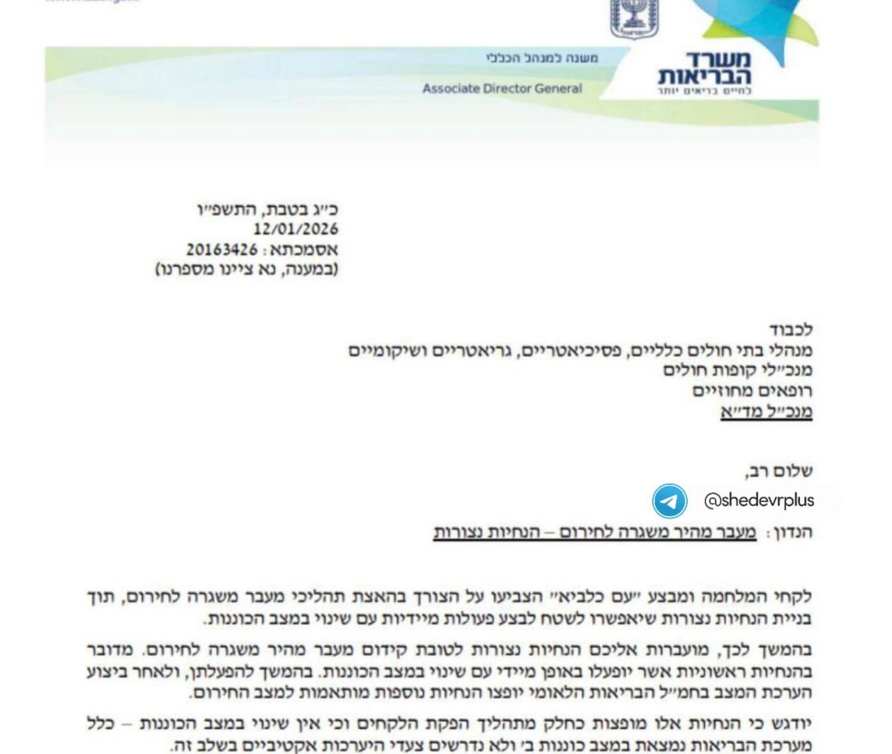 🇮🇱 Министерство здравоохранения Израиля сегодня утром направило руководителям больниц письмо с напоминанием о порядке быстрого перехода от обычного режима работы к чрезвычайному положению.