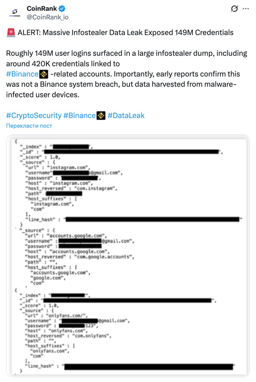 В числе пострадавших — около 420 000 аккаунтов Binance, а также Gmail, Facebook, Instagram и другие крупные сервисы. Причина — infostealer-вирусы, которые заражают устройства пользователей и крадут данные напрямую из браузеров.