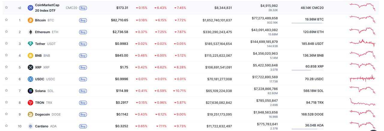 ▪️Биткоин в моменте падал к $81 311, сейчас цена стабилизировалась и торгуется около $82 800. ETH ниже $2750. Альткоины из топ-100 снижаются, однако масштабных двузначных падений пока нет.