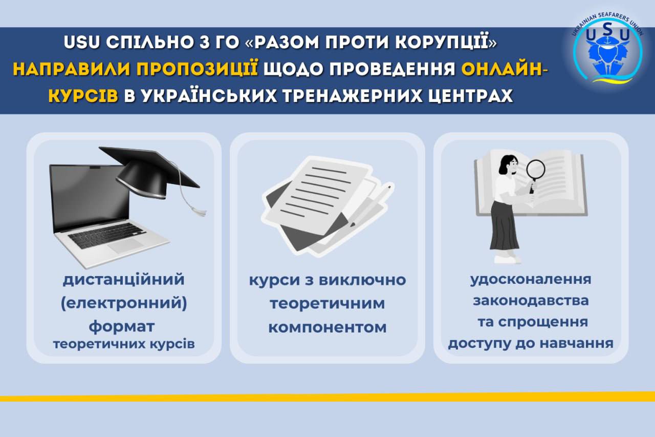 Ukrainian Seafarers Union спільно з ГО «Разом проти корупції» направили до профільного Міністерства та Адміністрації судноплавства України пропозиції щодо можливості застосування у навчально-тренажерних закладах дистанційного (електронного) формату проведення теоретичних курсів з підготовки моряків.