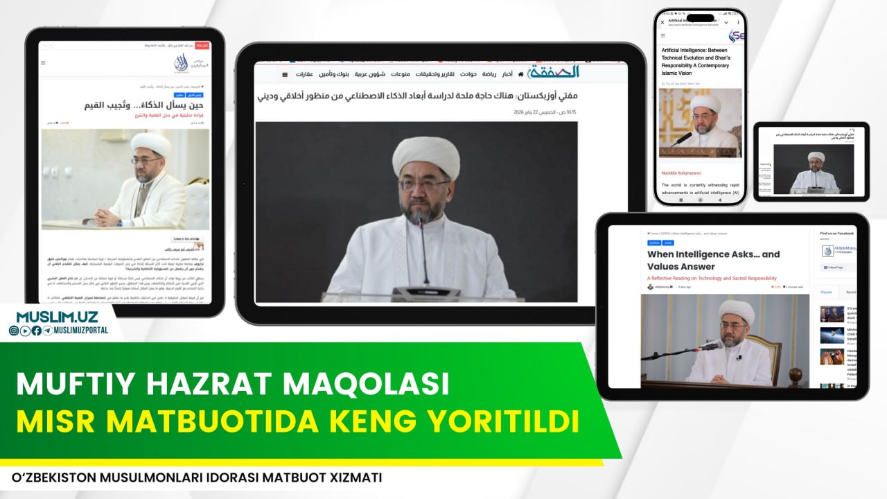 ✅ Ўзбекистон мусулмонлари идораси раиси, муфтий Шайх Нуриддин Холиқназар ҳазратларининг сунъий интеллект ҳақидаги мақоласи Миср Араб Республикасидаги бир неча юз минглаб кузатувчиларга эга see.news, darelhilal.com, aldiplomasy.com ва safqa.news каби интернет нашрларида араб ва инглиз тилларида кенг ёритилиб, жамоатчилик эътиборини тортди.