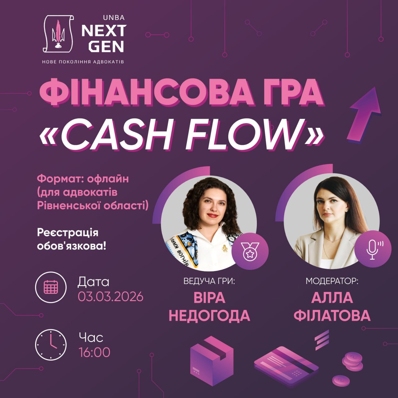 Ведуча гри: Віра Недогода - фінансова радниця BRAVE CAPITAL, інвесторка на фондовому ринку. Провела 300+ годин ігор Cash Flow, капітал клієнтів під управлінням — $1,5 млн, 60+ фінансових планів, 26 клієнтів в активному супроводі.