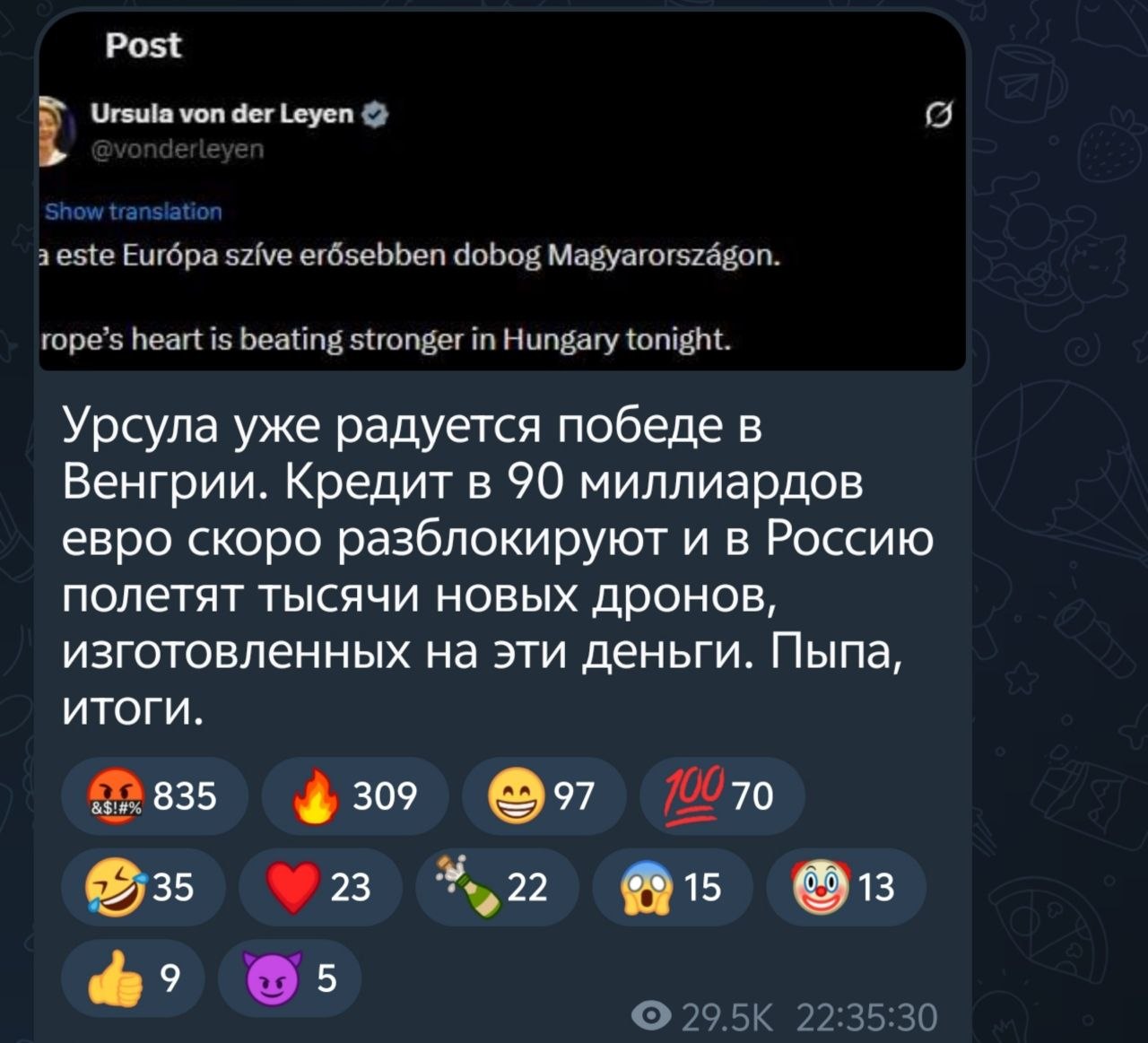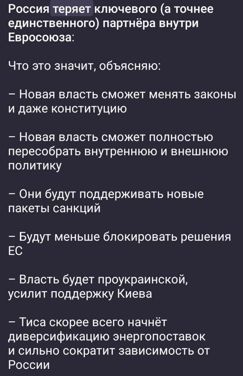 "Венгрия будет стремиться покупать самую безопасную и дешевую нефть. Как только эта война закончится, Европа отменит санкции, потому что приобретение сырья по завышенной цене не в интересах Европы", - заявил новый премьер страны.