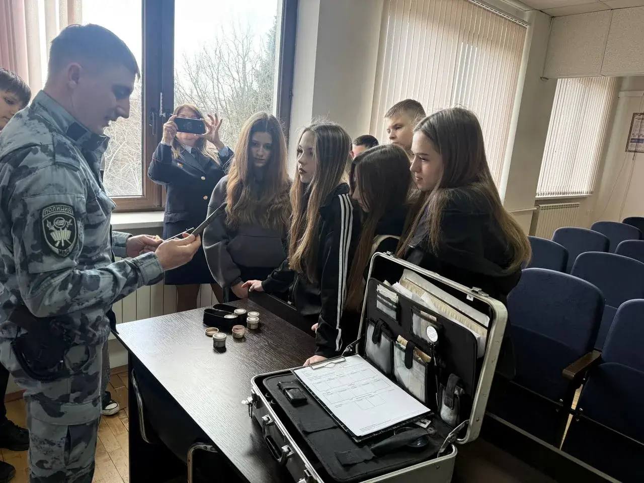 Особое внимание было уделено работе столь интересных и важных специалистов, как кинологи и эксперты-криминалисты. Ребятам рассказали о том, как четвероногие помощники, обладающие невероятным обонянием, помогают в раскрытии преступлений, поиске пропавших людей и обнаружении запрещённых веществ. Затем настало время погрузиться в мир микроскопов, улик и тщательного анализа – экскурсия в кабинет эксперта-криминалиста. Ученики с неподдельным интересом узнали, что каждый след, каждая пылинка могут стать ключом к разгадке тайны, и как важна наблюдательность и точность в этой кропотливой работе.