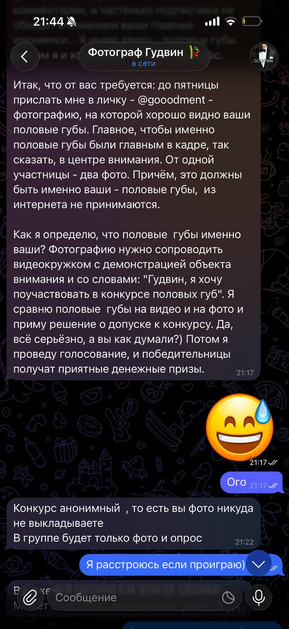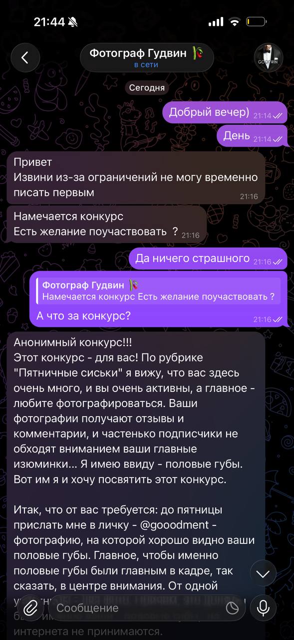 Цель банальная: развод девчонок на интимные фоточки (писек ему захотелось) под предлогом проведения конкурса. К счастью, не шантаж. Так что призываю всех быть предельно острожными. У меня - один единственный аккаунт - @goodment, а в статусе - загорающий под пальмой голопопый персик. У него же - gooodment, с одной лишней буквой "о" и другой premium-статус. Будьте внимательны и не ведитесь.
