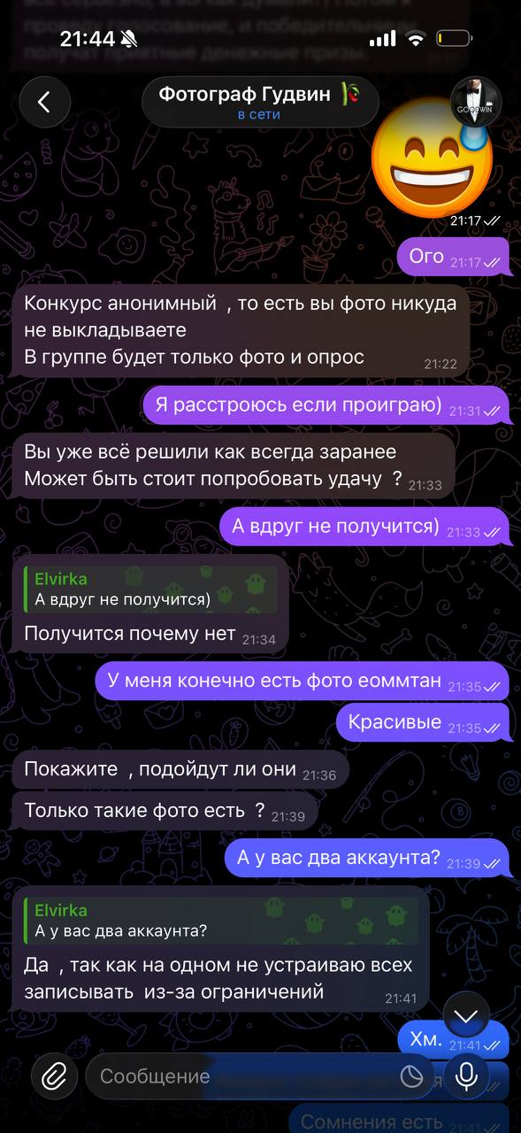 Далее, анонсы всех конкурсов есть у меня на канале. Если вам в ЛС кто-то втирает про конкурс, а на канале его нет - это фейк. Да и вообще, если вам кто-то пишет от моего лица, зайдите в закреп канала - там тоже есть мой настоящий акк, и напишите мне на него. Сам я очень редко кому-либо пишу. Наши прошлые переписки я не удаляю, и если вы помните, что мы с вами общались ранее, а сейчас переписка ведётся с чистого листа - это тоже фейк.