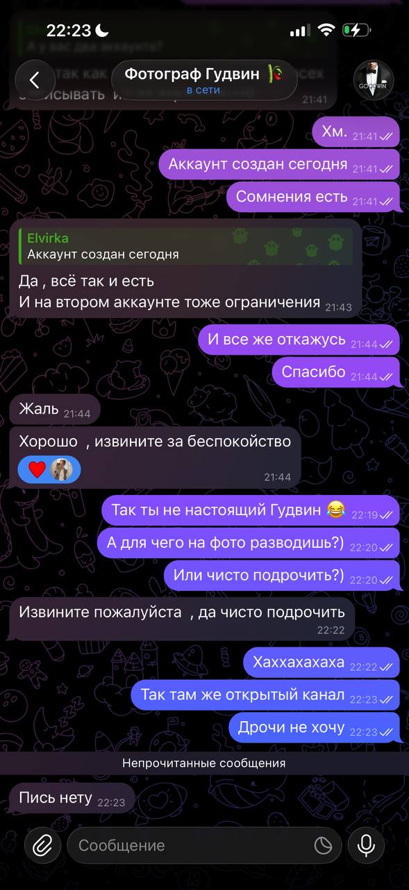 Ну что ж, друзья, весеннее обострение началось. Сегодня мне написали 18 моделей и подписчиц, в чьих каналах отметился мой фейк с приглашением к нему в ЛС по какому-то важному вопросу. Кто-то из них сразу почуял неладное, а кто-то поймал вот такую искромётную переписку с ним (один из примеров - на скринах). Сам он с лс писать не может, так как на него были жалобы за спам, и телега ему немного прищемила яйца.