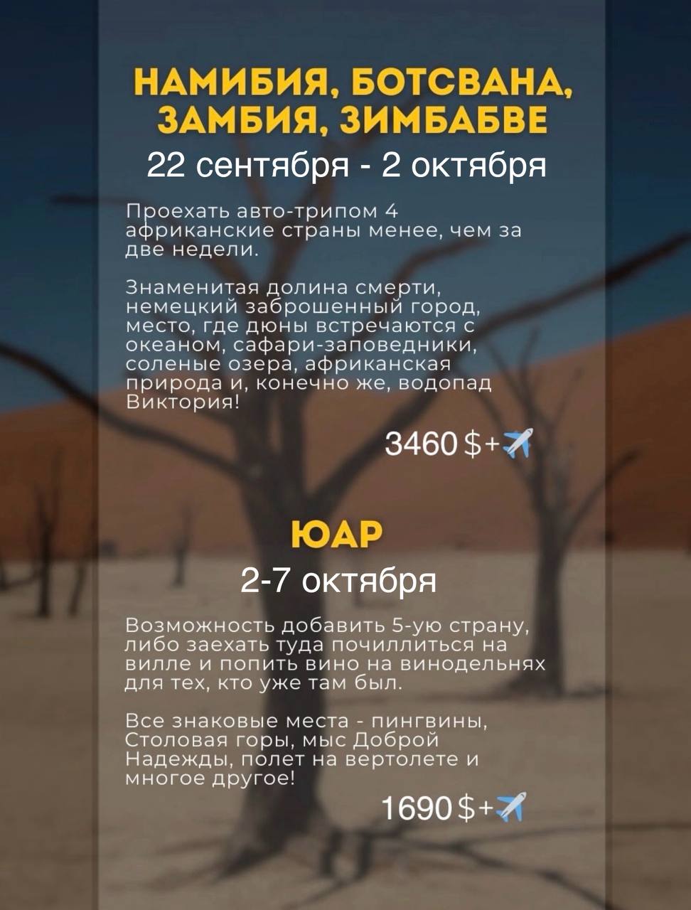 22.09-02.10 отправимся с вами по невероятным африканских странам, которые содержат в себе максимум - комфорт, красота, африканскость, но при этом высокий (!) уровень сервиса, вкусная еда, продуманность во всем, ну а бомбезность природы просто зашкаливает (смотрите на сайте, кто не верит)