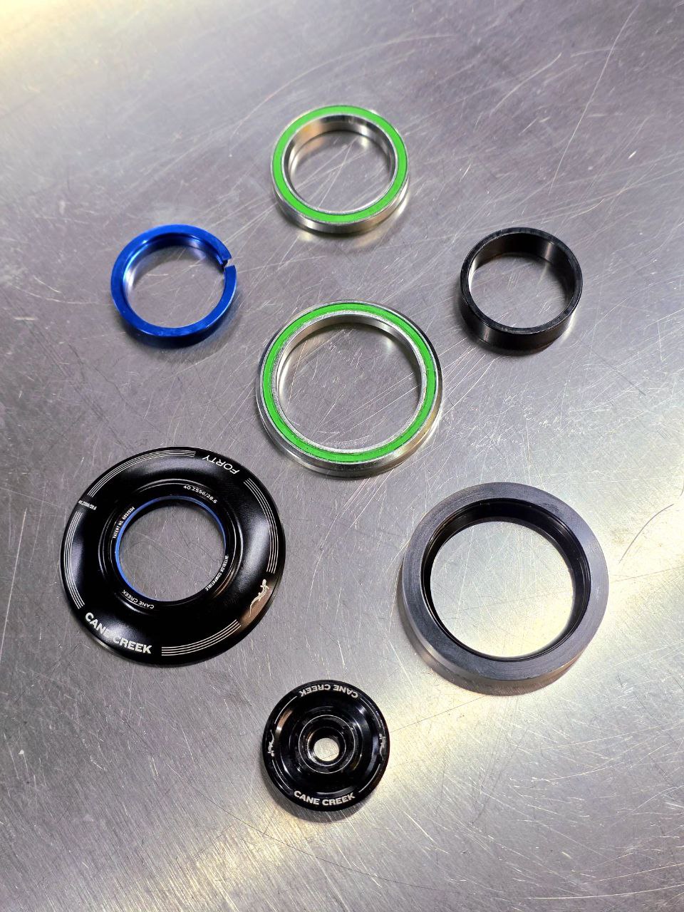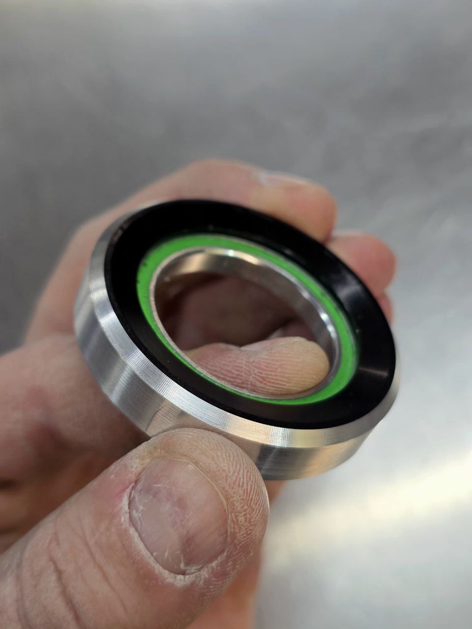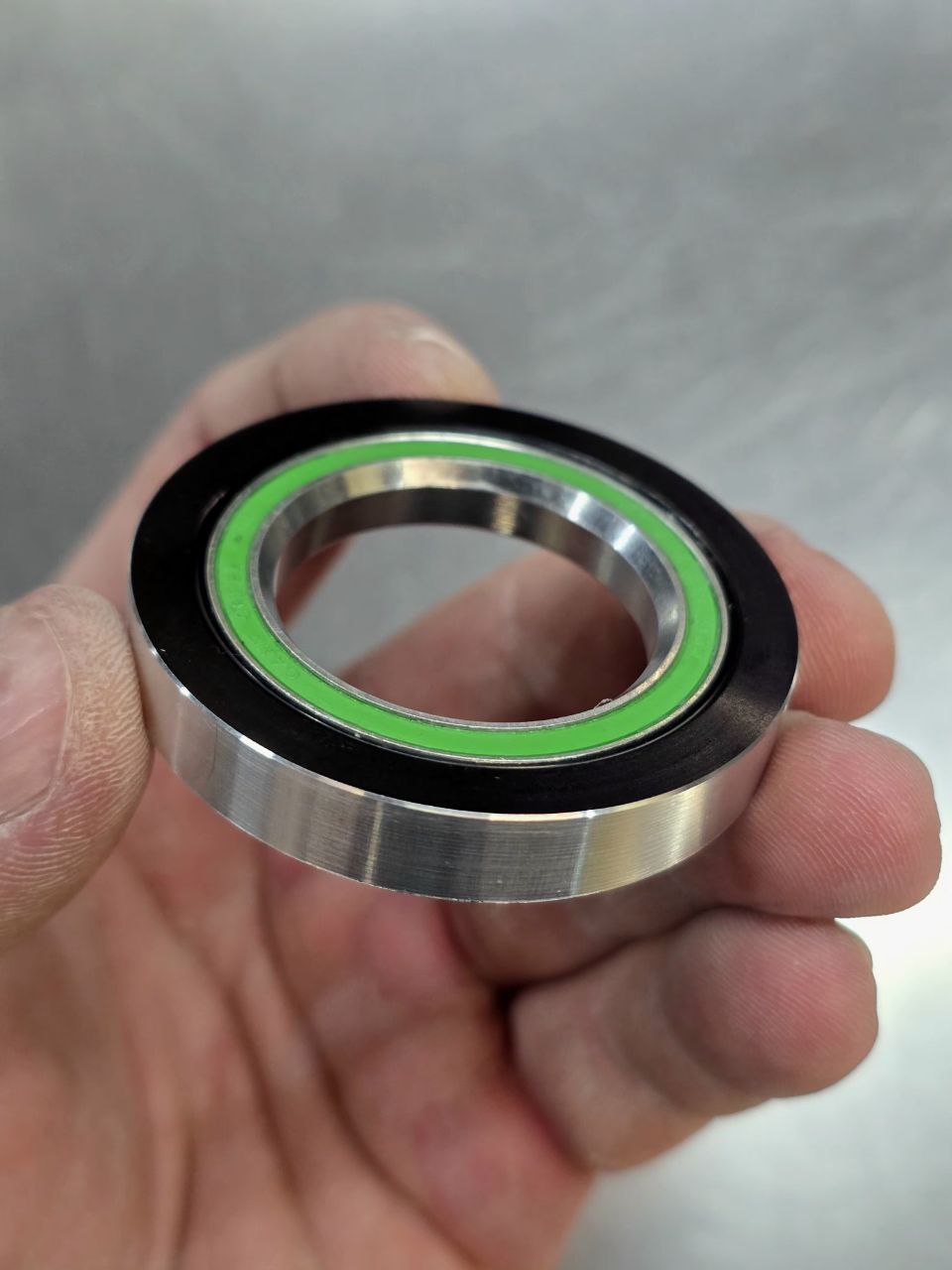 Вообще, мне казалось, что такое решение очевидно, но реакция моих коллег на отправленные им фотки говорит об обратном. Купил я вполне стандартную верхнюю часть рулевой CaneCreek 40, с помощью двух проходов на токарном станке сделал из верхней чашки ZS 56 под 41-мм подшипник 52-мм переходник, который падает в рулевую вместо большого подшипника и вмещает в себя маленький. 10 минут работы и проблема решена.