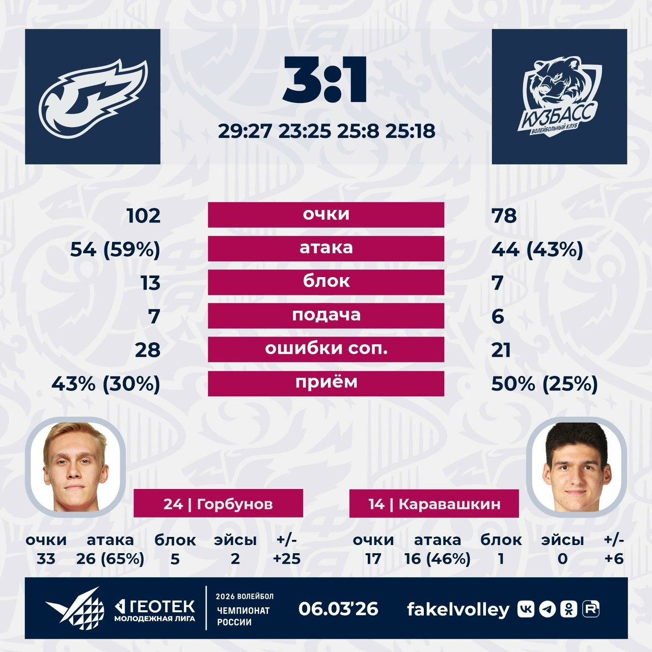 🔥🐻❄️ Сегодня самым результативным игроком двух «Факелов» стал диагональный Алексей Горбунов! 😵 Он заработал аж 33 очка (в Телеграме за него проголосовало всего 7 человек)!