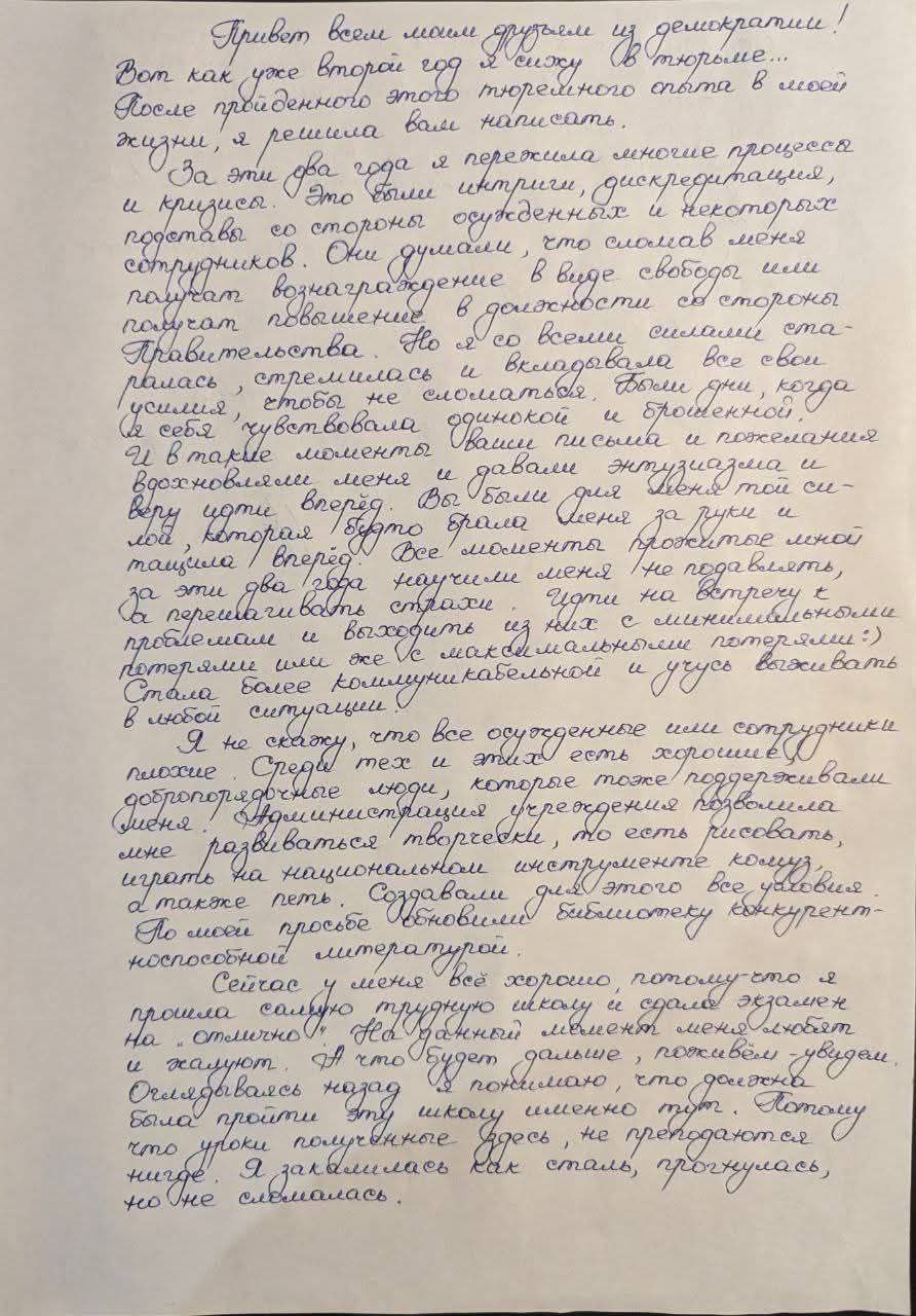 В своем письме она пишет, что за два года в заключении пережила тяжелые моменты, давление и попытки сломить её, но смогла пройти через это и сохранить внутреннюю стойкость.