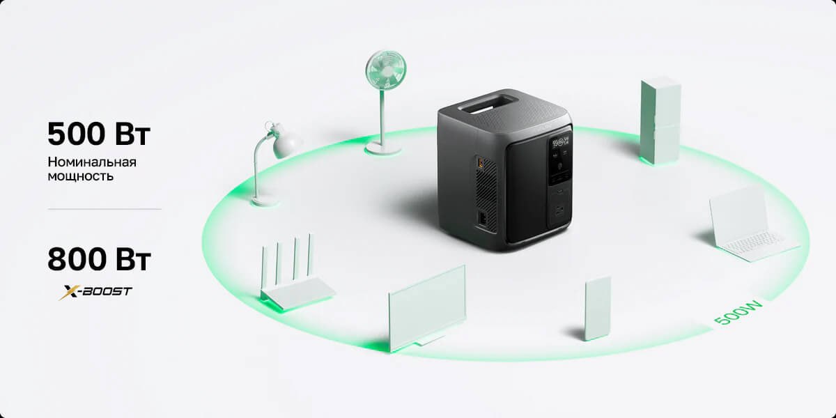 Выходная мощность (переменный ток) 500 Вт: 800 Вт (пиковая нагрузка 1000 Вт) с технологией X-Boost. Питает 99% необходимой бытовой техники;