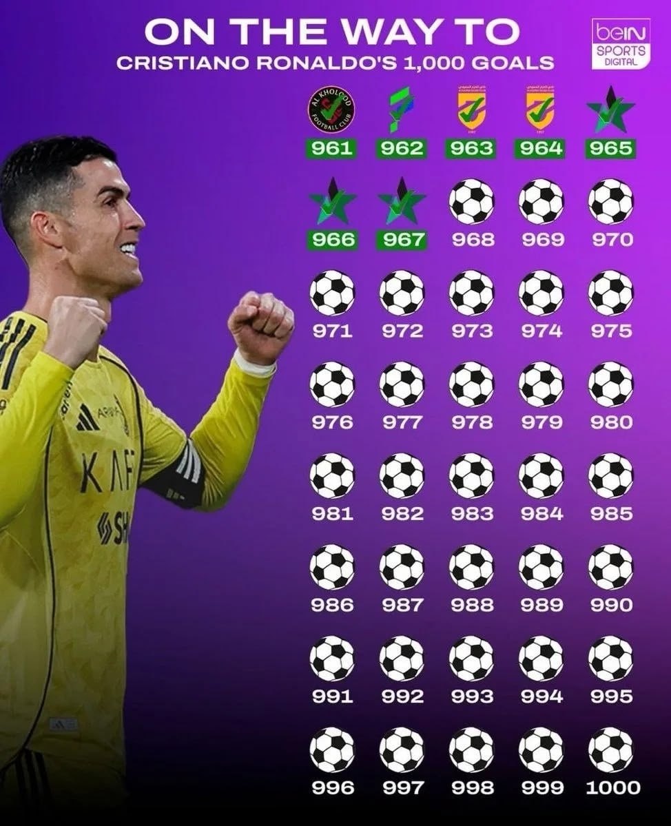 🔜 Криштиану Роналду осталось забить всего 33 гола до исторической отметки в 1000 голов.