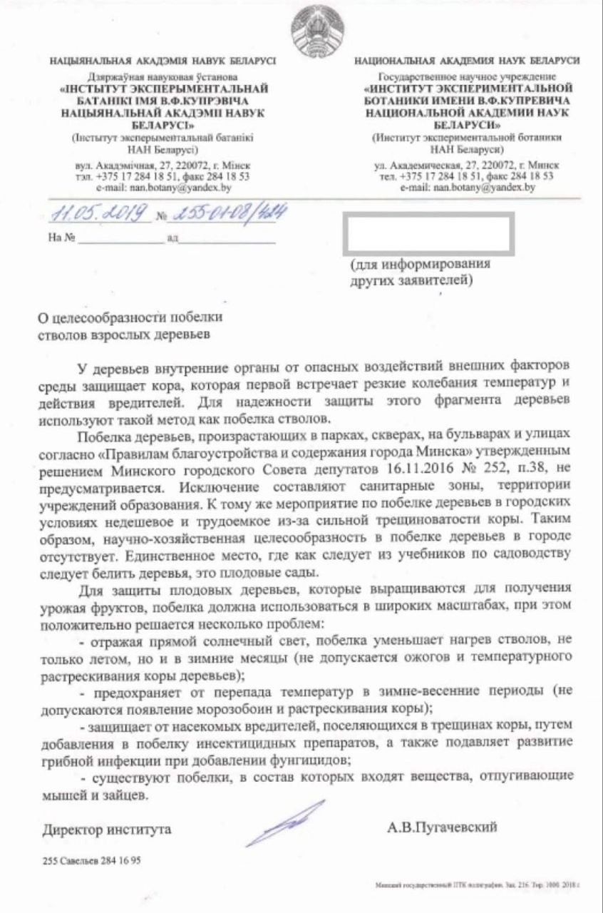 • в соответствии с п.38 Правил благоустройства и содержания г.Минска, "вырубка деревьев, кустарников, срывание цветов с цветников, побелка деревьев в парках, скверах и бульварах не предусматриваются";