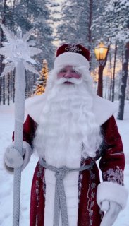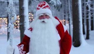 Дед Мороз стоит [на фоне леса], идёт снег, новогодняя атмосфера. Он смотрит в камеру и говорит по-русски: