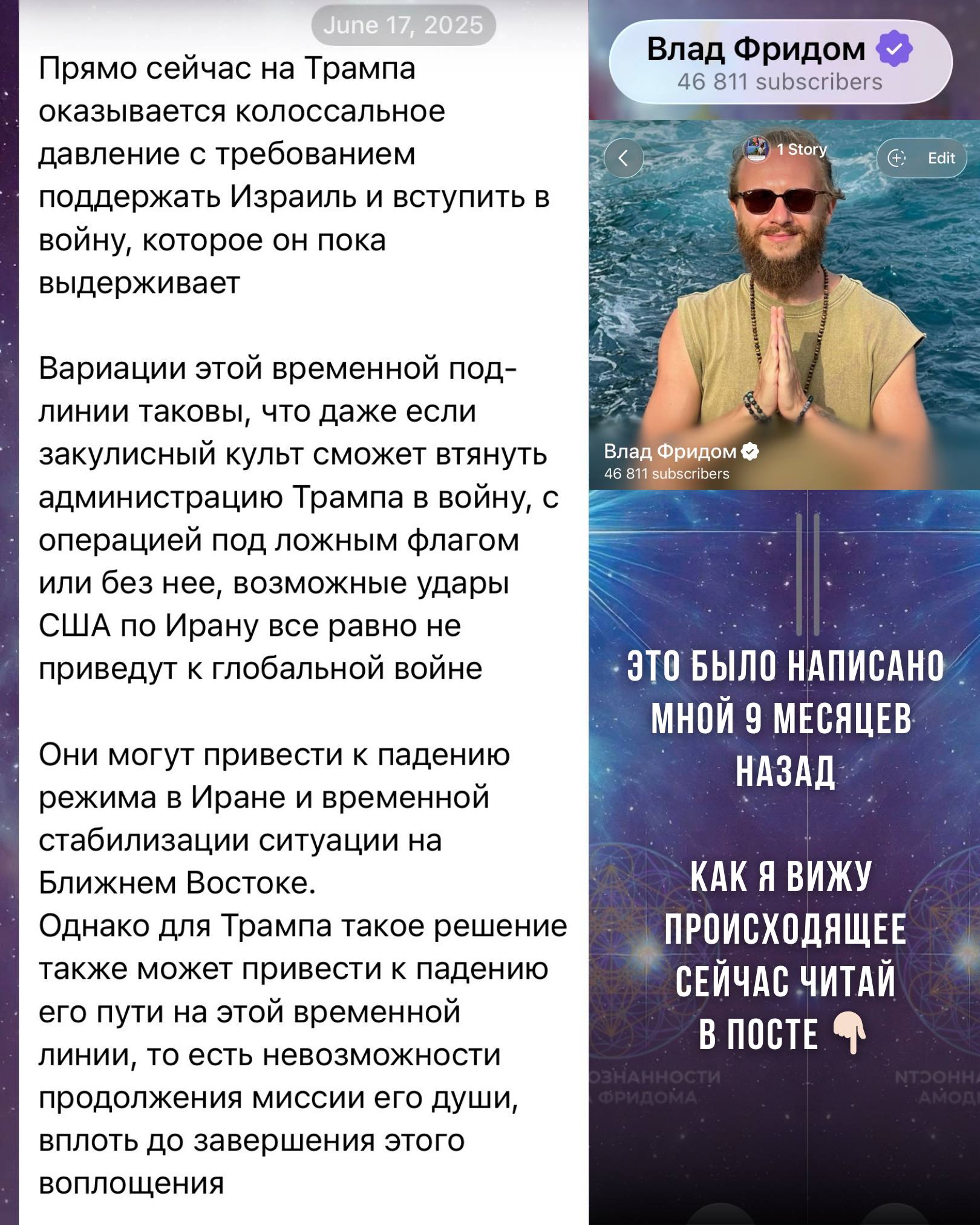 То есть подтверждается всё то, что я говорил на эфирах, в т.ч. у Ивана – что действия Трампа – это «превентивная попытка» не допустить Третьей мировой войны между Израилем и Ираном.