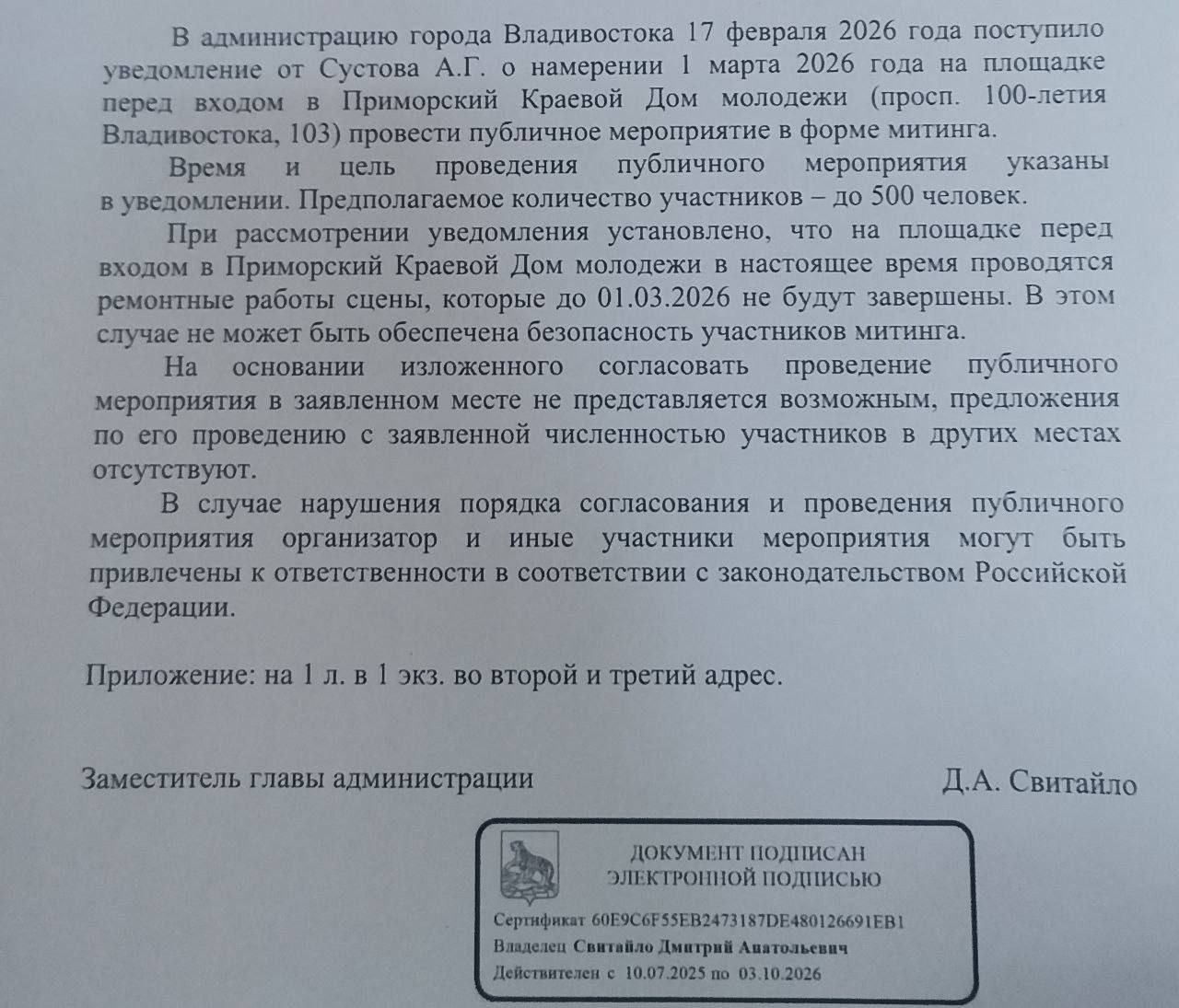 Администрация Владивостока снова не согласовала проведение митинга депутатам-коммунистам. В качестве причины указаны продолжающиеся ремонтные работы на площадке перед Домом молодёжи — та же формулировка звучала и при предыдущем отказе.
