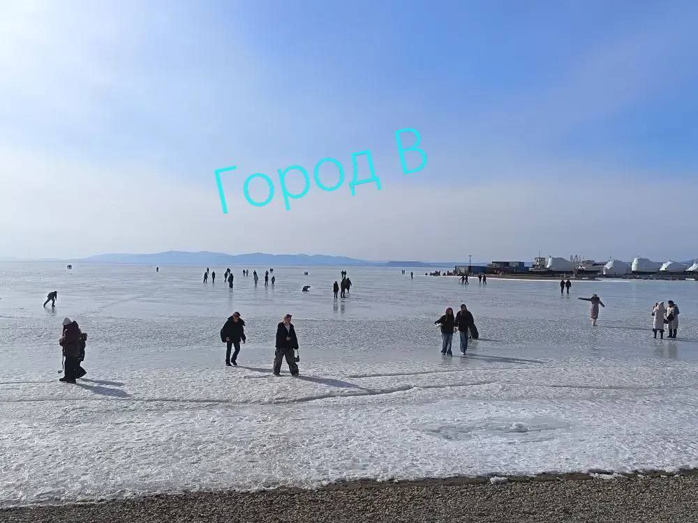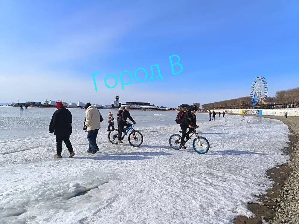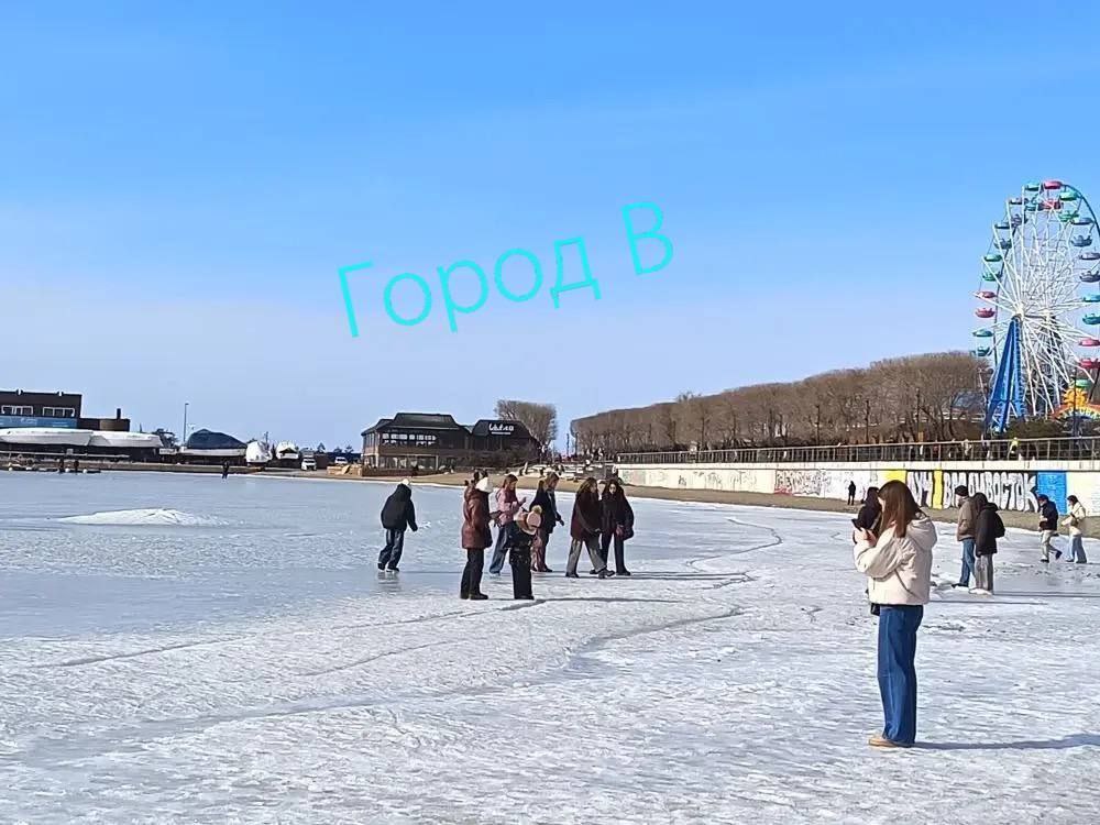 Набережная Спортивной гавани. Лёд тает, но люди продолжают выходить на него — с колясками, детьми, просто прогуляться. Напоминаем: выход на лёд во Владивостоке запрещён. Это не просто надпись, а реальная опасность.