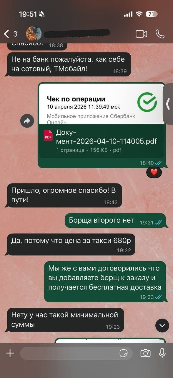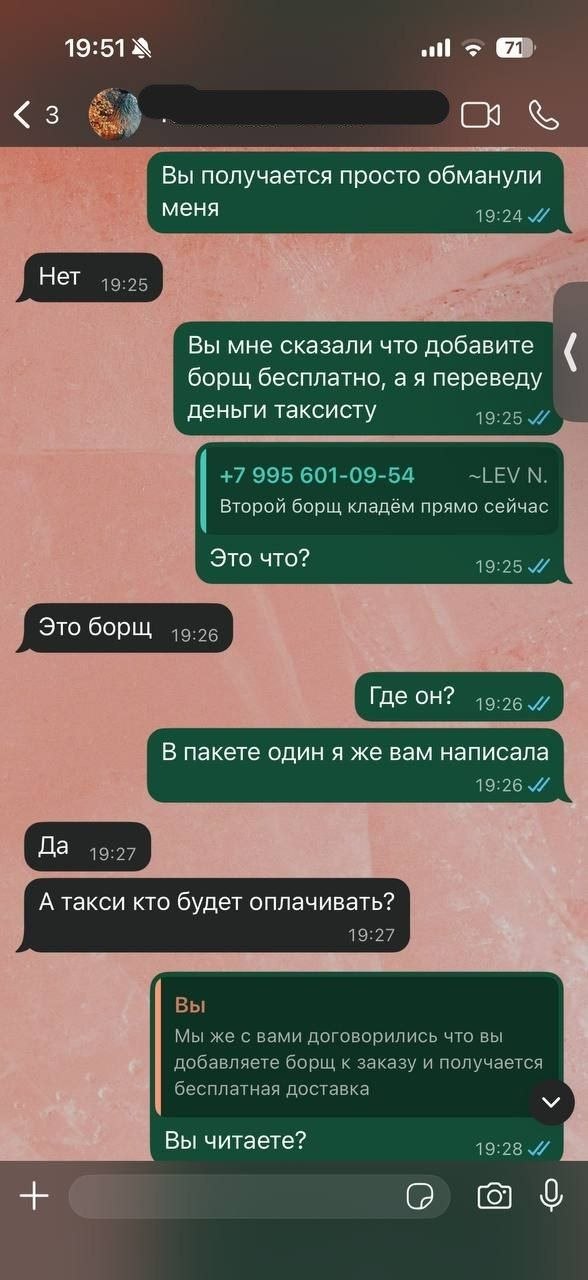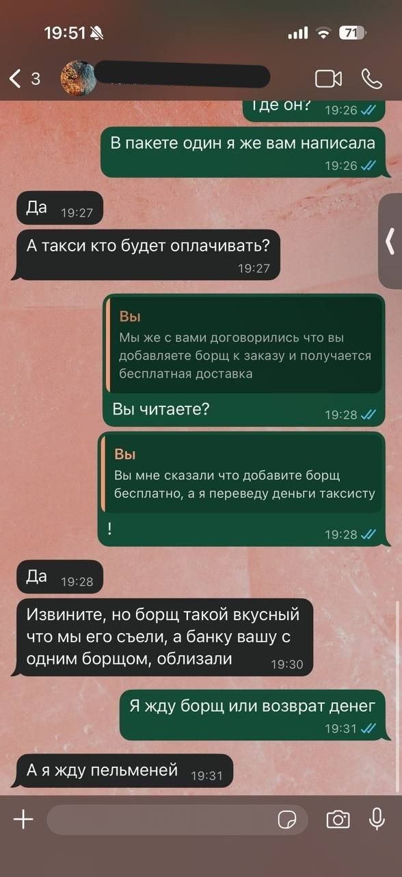 Мы маленькое кафе , гость сделал заказ с доставкой на дом,вызвали курьера из всем известной службы заказа такси , приехал мужчина и забрал заказ, гость полностью оплатил заказ а кафе оплатило курьера и тут началось самое интересное, во время поездки водитель стал названивать гостю представившись хозяином заведения и предлагать купить еще одно блюдо для того что бы не платить за доставку в виду того что за пять минут выросли цены на бензин упал доллар, прилетела комета и потребуется доплатить за доставку но если купить еще немного еды все станет хорошо, повторюсь заказ и доставка оплачена, гость согласился, деньги были переведены водителю, после того как гость получил заказ и не увидел добавленного блюда на вопрос где моя еда он сказал что все съел сам ему было вкусно и деньги он не вернет.администратор естественно сам связался с водителем и был послан куда подальше, создалось впечатление что водитель употребил что то плохое, пишем для того что бы люди были осторожны при заказе машины, не известно как такой человек может себя повести во время езды с пассажирами.