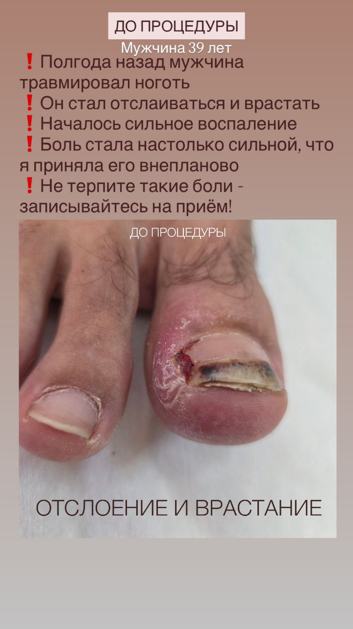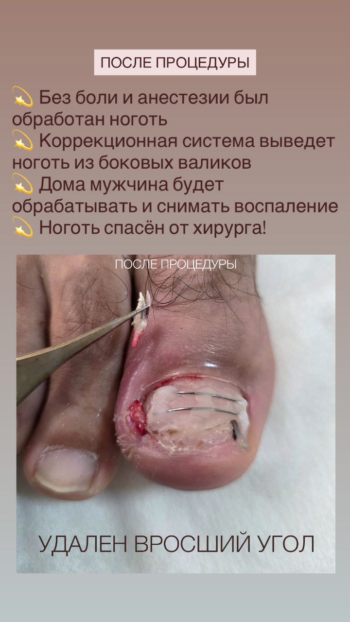 26 декабря на приём пришёл мужчина 39 лет. У него травмированный ноготь - полгода назад он повредил его. И тот вроде даже начал нормально расти, но в какой-то момент стал отслаиваться и разрыхляться. И начал врастать в углу. Мужчина пытался выстричь ноготь из угла, но сделал это неудачно: остался острый осколок, который вызвал воспаление. Мужчина не выдержал и срочно пришёл на приём, где на процедуре была сделана зачистка, удален сложный угол, и установлена титановая нить. Ноготь буквально спасли от хирурга! Теперь дома он будет снимать воспаление и обрабатывать ноготь. Главное, что его мучения теперь позади! Он будет встречать Новый год без болей! Очень рада была помочь!🙏