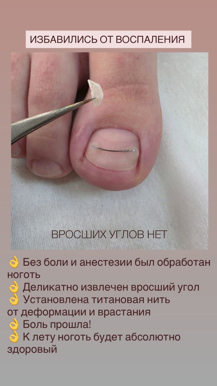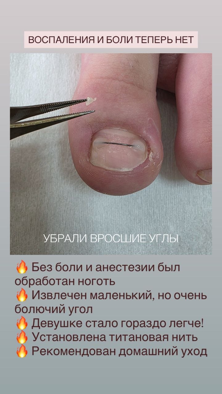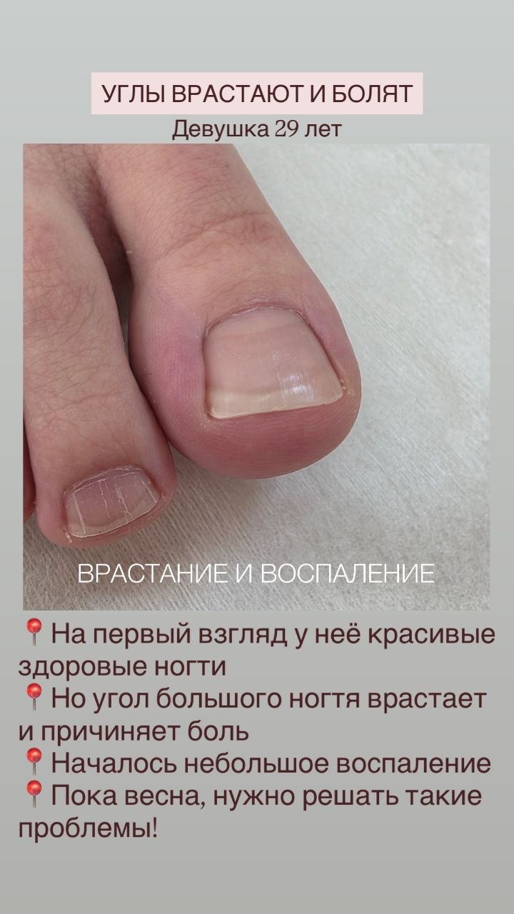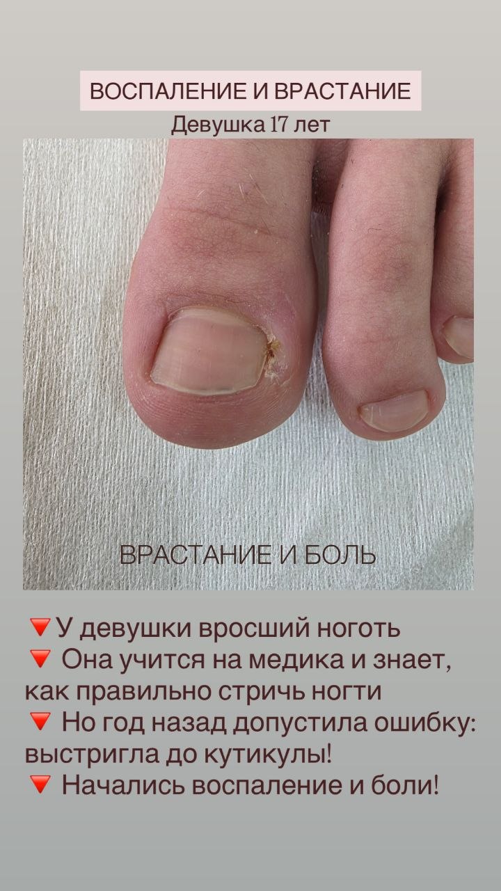 18 марта пришла девушка 17 лет. У неё боль от вросшего ногтя. Она учится на медика, поэтому понимает, как правильно ухаживать за ногтями. И видно, что ногти в целом в хорошем состоянии. Но примерно год назад неудачно выстригла угол, и тот начал врастать. Устав от постоянного дискомфорта, она выстригла почти до самой кутикулы. Началось воспаление. И чтобы не идти к хирургу, девушка пришла ко мне, где на процедуре был деликатно обработан ноготь, и извлечен маленький колющий кусочек. Установлена коррекционная система. Рекомендован домашний уход. Очень рада была помочь!🙏