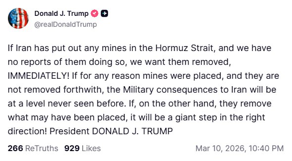 Если Иран предпримет какие-либо действия, которые приведут к прекращению поставок нефти через Ормузский пролив, Соединенные Штаты Америки нанесут ему УДАР В ДВАДЦАТЬ РАЗ СИЛЬНЕЕ, чем все предыдущие. Кроме того, мы уничтожим лёгкие для уничтожения цели, что сделает практически невозможным восстановление Ирана как нации — Смерть, Огонь и Ярость обрушатся на них — Но я надеюсь и молюсь, чтобы этого не произошло! Это подарок Соединённых Штатов Америки Китаю и всем странам, которые активно используют Ормузский пролив. Надеюсь, этот жест будет высоко оценен.