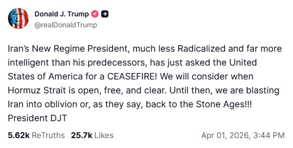 Новый президент Ирана, гораздо менее радикальный и гораздо более разумный, чем его предшественники, только что обратился к Соединённым Штатам Америки с просьбой о ПРЕКРАЩЕНИИ ОГНЯ! Мы рассмотрим этот вопрос, когда Ормузский пролив станет открытым, свободным и безопасным. А до тех пор мы разнесем Иран в пух и прах или, как говорится, отправим его обратно в каменный век!!!