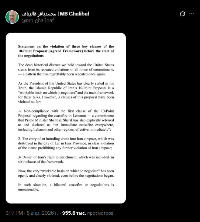 Как ясно заявил президент Соединенных Штатов в своей соцсети «Правда», Предложение из 10 пунктов Исламской Республики Иран является «рабочей основой для переговоров» и основной рамочной структурой для этих переговоров. Однако на данный момент нарушены три положения этого предложения: