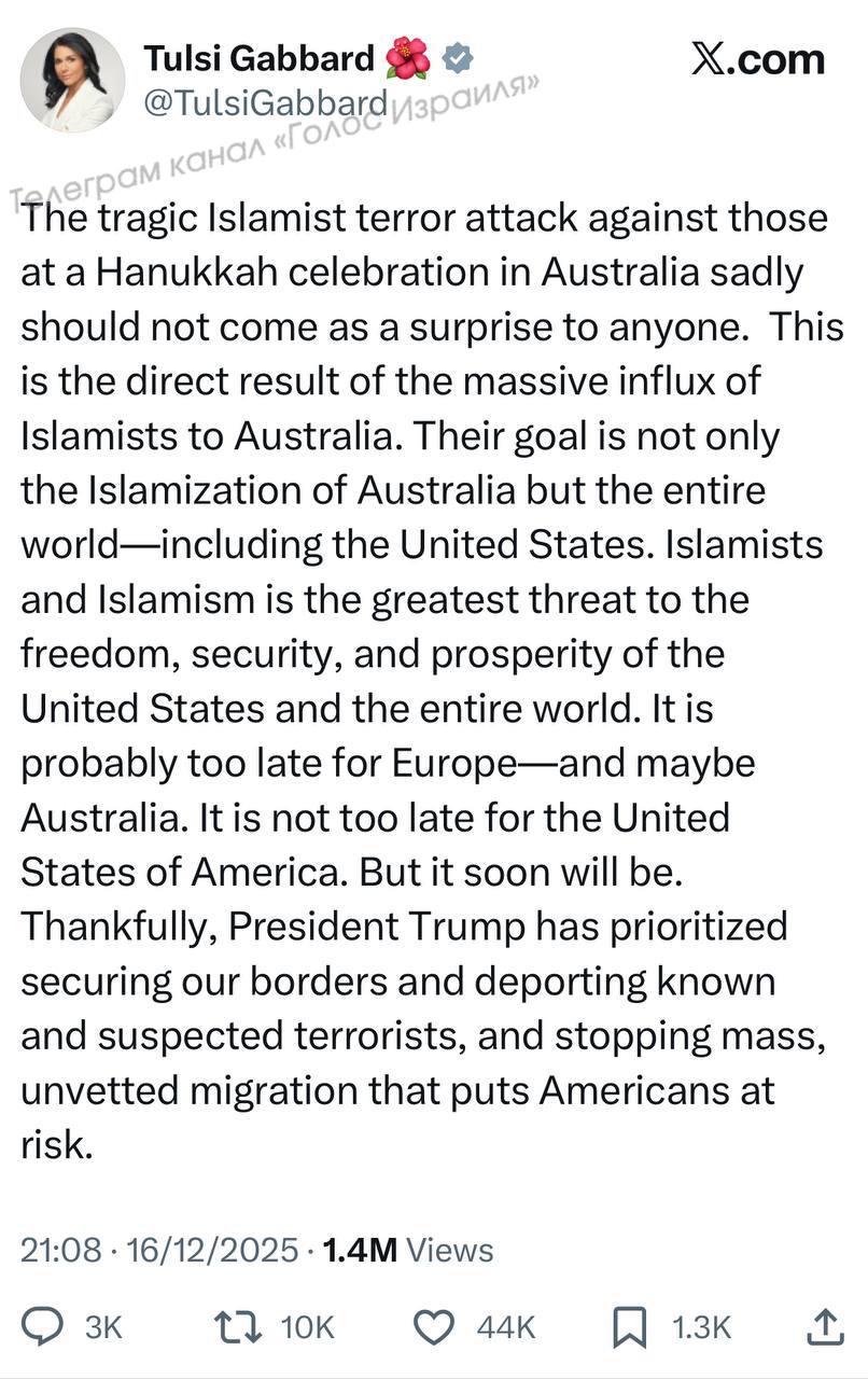 «Трагическая исламистская террористическая атака на участников празднования Хануки в Австралии, к сожалению, не должна никого удивлять. Это прямое следствие массового притока исламистов в Австралию. Их цель — не только исламизация [захват] Австралии, но и всего мира, включая Соединённые Штаты.