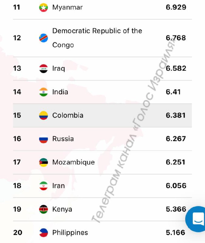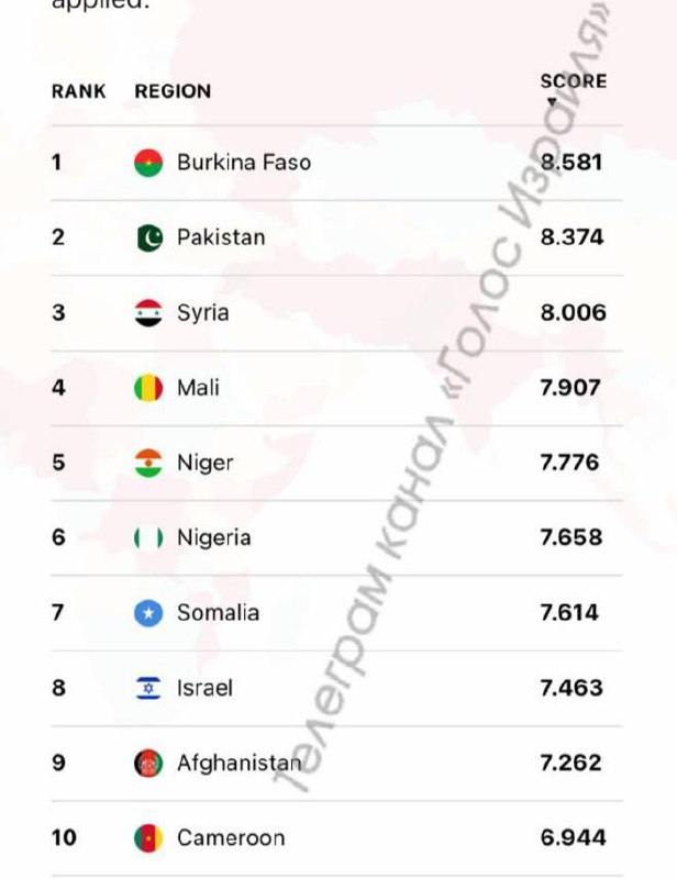 ⚡️Израиль, Россия и Украина заняли последние места в рейтинге стран по уровню безопасности проживания.