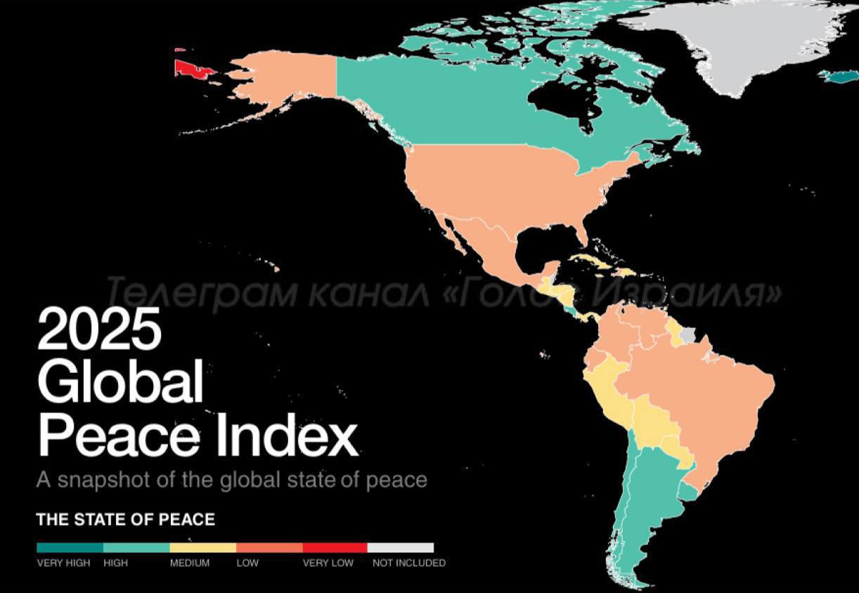 По данным ежегодного рейтинга Global Peace Index (GPI) 2025, самыми небезопасными странами оказались Израиль, Россия, Украина, Судан, Республика Конго, Йемен, Афганистан, Сирия и КНДР, все они оказались в конце списка.
