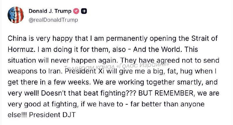 Китай очень доволен тем, что я навсегда открываю Ормузский пролив. Я делаю это и для них — и для всего мира. Такая ситуация больше никогда не повторится. Они согласились не поставлять оружие Ирану. Президент Си крепко меня обнимет, когда я приеду к нему через несколько недель. Мы работаем вместе умно и очень эффективно! Разве это не лучше, чем воевать??? НО ПОМНИТЕ, мы очень хорошо умеем воевать, если придётся — гораздо лучше, чем кто-либо другой!!!